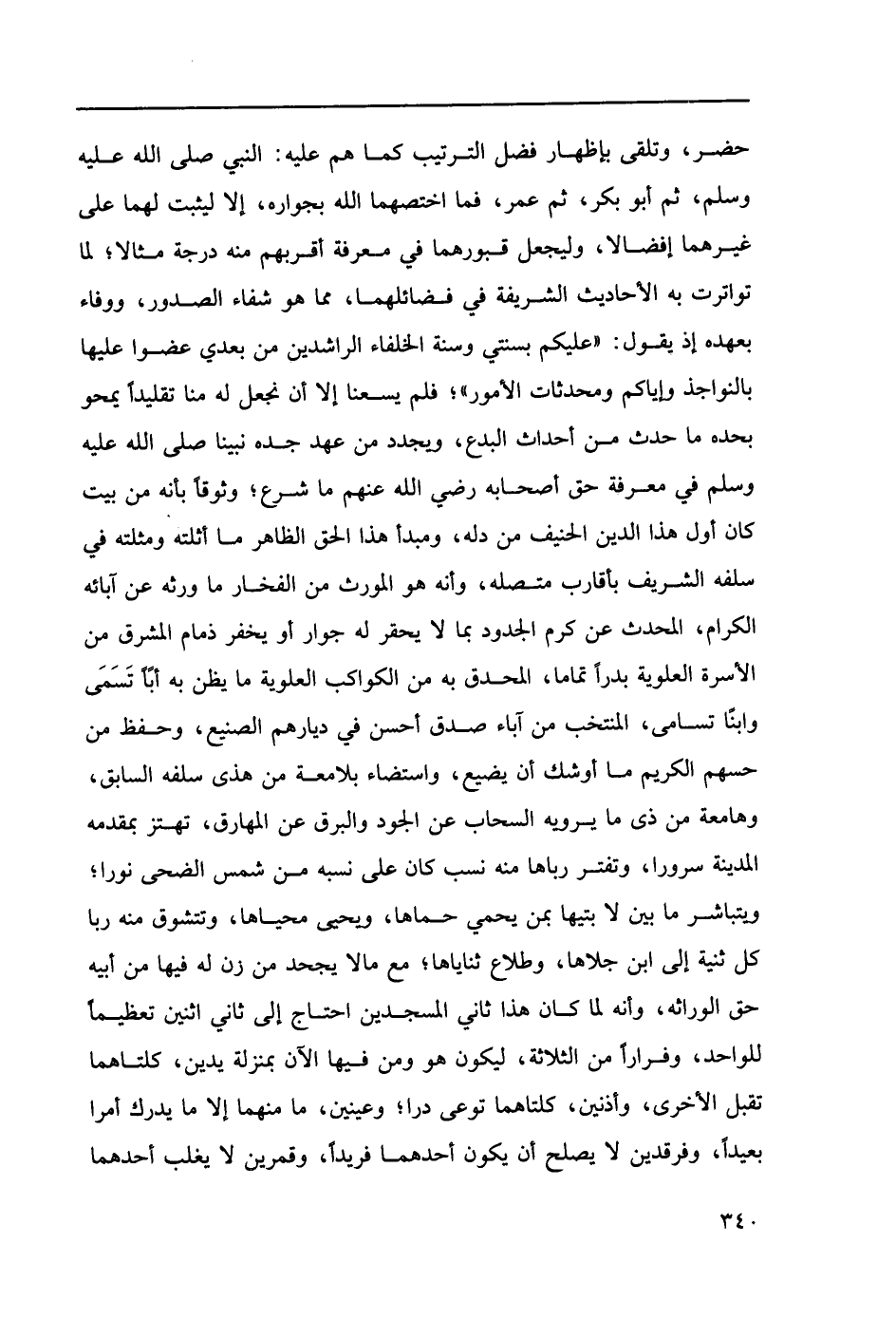 حضر، وتلقى فإظهار فضل الترتيب كما هم عليه: صلى الله عليه وسلم، ثم أبو بكر، ثم عمر، فما اختصهما الله بجواره، إلا ليثبت لهما على غيرهما إفضالا، وليجعل قبورهما في معرفة أقربهم منه درجة مثالا؛ لما تواترت به الأحاديث الشريفة في فضائلهما، مما هو شفاء الصدور، ووفاء بعده إذ يقول: " عليكم بنبي وسنة الخلفاء الراشدين من بعدي عضوا عليها بالنواجذ وإياكم ومحدثات الأمور"؛ فلم يسعنا إلا أن نجعل له منا تقليداً يمحو بحده ماحدث من أحداث البدع، ويجدد من عهد جده نبينا صلى الله عليه وسلم في معرفة حق أصحابه رضي الله عنهم ما شرع؛ وثوقاً بأنه من بيت كان أول هذا الدينالحنيف من دله، ومبدأ هذا الحق الظاهر ما أثلته ومثلته في سلفه الشريف بأقارب متصلة، وأنه هو المورث من الفخار ما ورثه عن آبائه الكرام، المحدث عن كرم الجدود بما لا يحقر له جوار أو يخفر ذمام المشرق من الأسرة العلوية بدراً تماما، المحدق به من الكواكب العلوية ما يظن به أباً تَسَمَى وابناً تسامى، النتخب من آباء صدق أحسن في ديارهم الصنيع، وحفظ من حسهم الكريم ما أوشك أن يضيع، واستضاء بلامعة من هذى سلفه السابق، وهامعة من ذي ما يرويه السحاب عن الجود والبرق عن المهارق، تهتز بمقدمه المدينة سرورا، وتفتر رباه منه نسب كان على نسبه من شمس الضحى نورا؛ ويتباشر ما بين لا بتيها بمن يحمي حماها، ويحيى محياها، وتتشوق منه ربا كل ثنية إلى ابن جلاها، وطلاع ثناياها؛ مع مال يجحد من زن له فيها من أبيه حق الوراثه، وأنه لما كان هذا ثاني المسجدين احتاج إلى ثاني اثنين تعظيماً للواحد، وفراراً من الثلاثة، ليكون هو ومن فيها الآن بمنزلة يدين، كلتاهما تقبل الأخرى، وأذنين، كلتاهما توعى درا؛ وعينين، مامنهما إلا ما يدرك أمرا بعيداً، وفرقدين لا يصلح أن يكون أحدهما فريداً، وقمرين لا يغلب أحدهما…