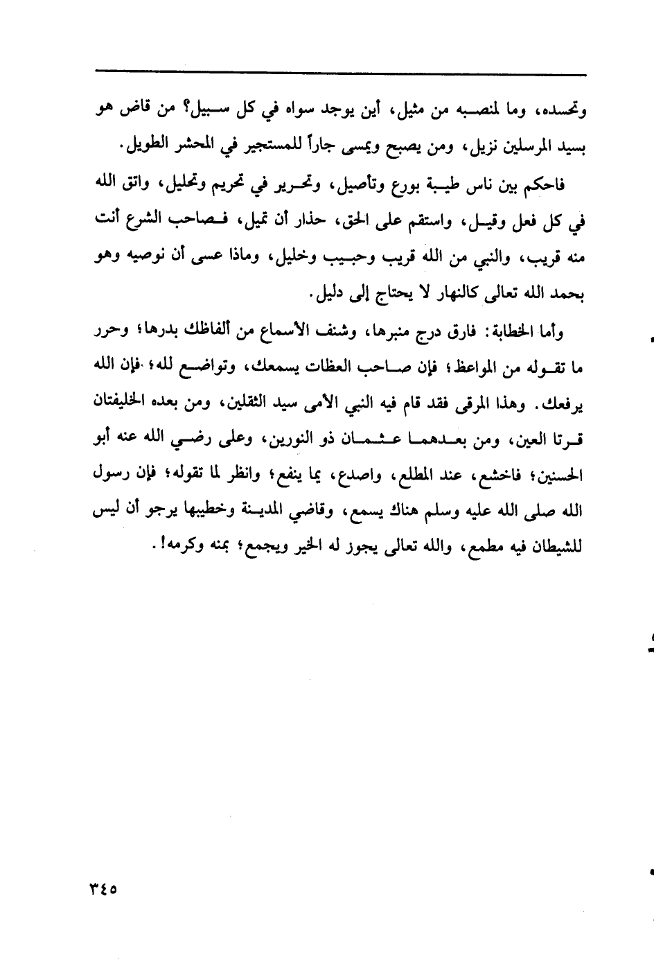 وأما الخطابة: فاق درج منبرها، وشنف الأسماع من ألفاظك بدرها؛ وحرر ما تقوله من المواعظ؛ فإن صاحب المعظات يسمعك، وتواضع لله؛ فإن الله يرفعك. وهذا المرقى فقد قام فيه النبي الأمى سيد الثقلين، ومن بعده الخليفتان قرتا العين، ومن بعدهما عثمان ذو النورين، وعلى رضي الله عنه أبو الحسنين؛ فاخشع، عند المطلع، واصدع، بما ينفع؛ وانظر لما تقوله؛ فإن رسول الله صلىالله عليه وسلم هناك يسمع، وقاضي المدينة وخطيبها يرجو أن ليس للشيطان فيه مطمع، والله تعالى يجوز له الخير ويجمع؛ بمنه وكرمه!.…
