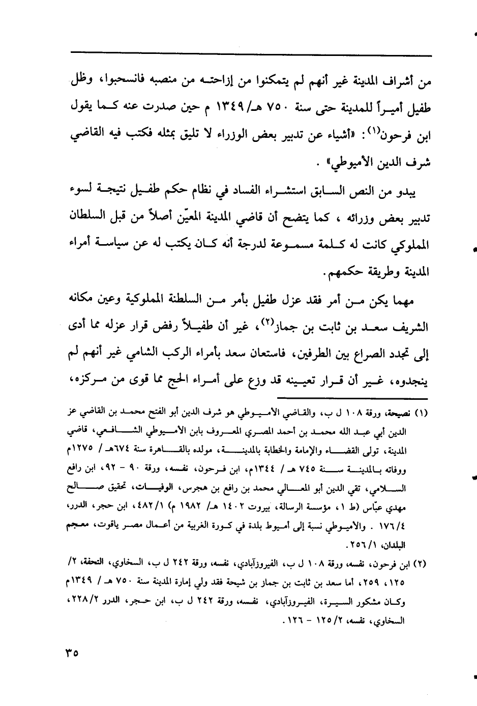 (2) ابن فرحون، نفسه، ورقة 108 ل ب، الفيروزآبادي، نفسه، ورقة 242 ل ب، السخاوي، التحفة، 2/ 125 - 259، أما سعد بن ثابت بن جماز بن شيحة فقد ولي إمارة المدينة سنة 750هـ/1349م وكان مشكور السيرة، الفيروزآبادي، نفسه، ورقة 242 ل ب، ابن حجر، الدرر 228/ 2، السخاوي، نفسه، 2/ 125 - 126.