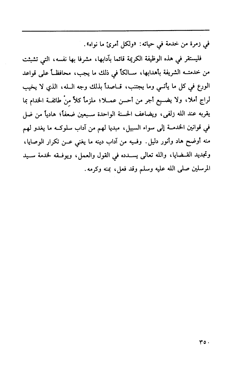 فليستقر في هذه الوظيفة الكريمة قائما بآدابها، مشرفا بها، التي تشبثت من خدمته الشريفة بأهدابها، سالكاً في ذلك ما يجب، محافظاً على قواعد الورع في كل ما ياتي وما يجتنب، قاصداً بذلك وجه الله، الذي لا يخيب لراج أملا، ولا يضيع أجر من أحسن عملا؛ ملزماً كلاً من طائفة الخدام بما يقربه عند الله زلفى، ويضاعف الحسنة الواحدة سبعين ضعفاً؛ هادياً من ضل في قوانين الخدمة إلى سواء السبيل، مبديا لهم من آداب دينه ما يغني عن تكرار الوصايا، وتجديد القضايا، والله تعالى يسدده في القول والعمل، ويوفقه لخدمة سيد المرسلين صلى الله عليه وسلم وقد فعل، بمنه وكرمه.…