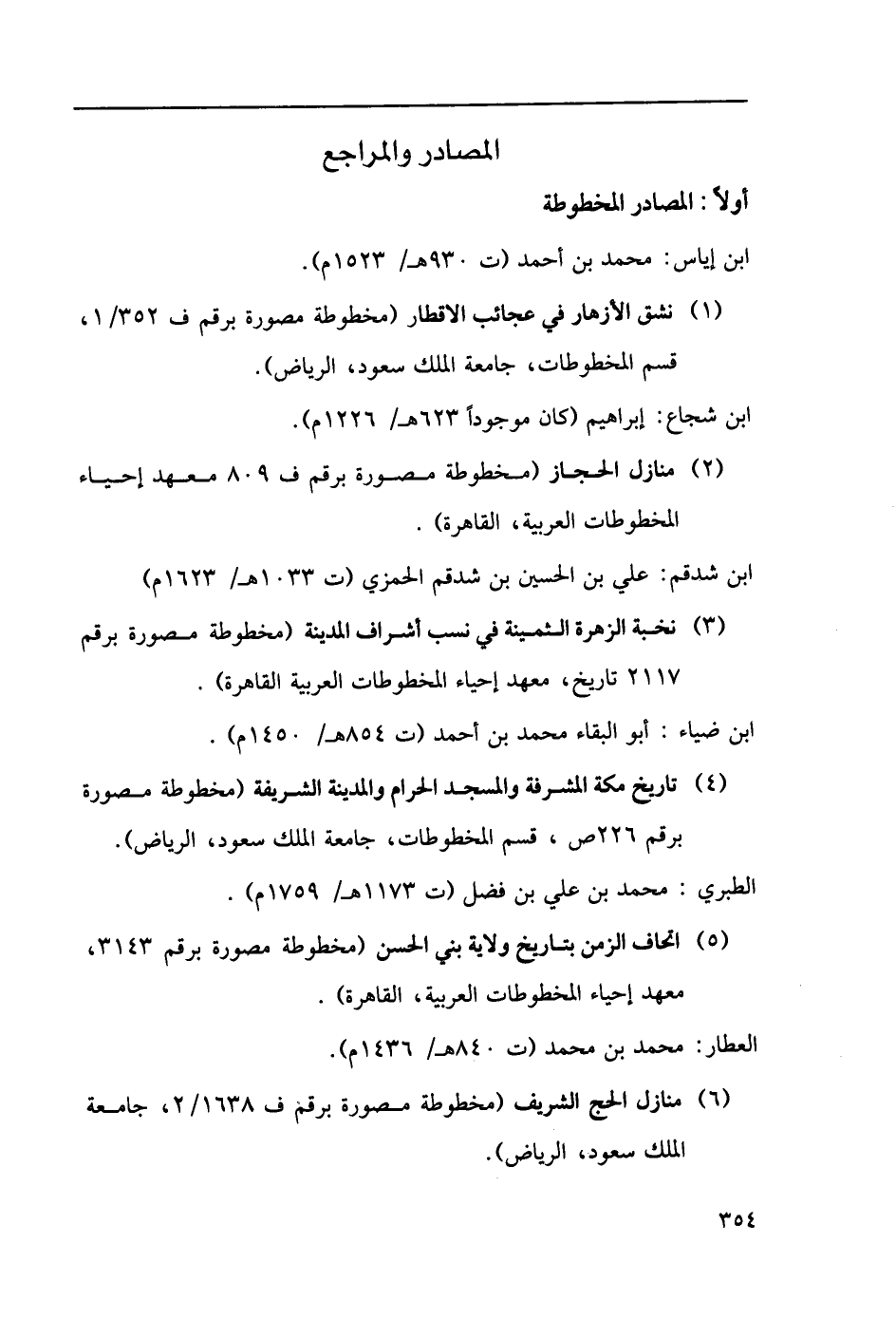 (4) تاريخ مكة المشرفة والمسجد الحرام والمدينة الشريفة (مخطوطة مصورة برقم 226ص، قسم المخطوطات، جامعة الملك سعود، الرياض). الطبري: محمد بن علي بن فضل (ت 1173هـ/1759م).