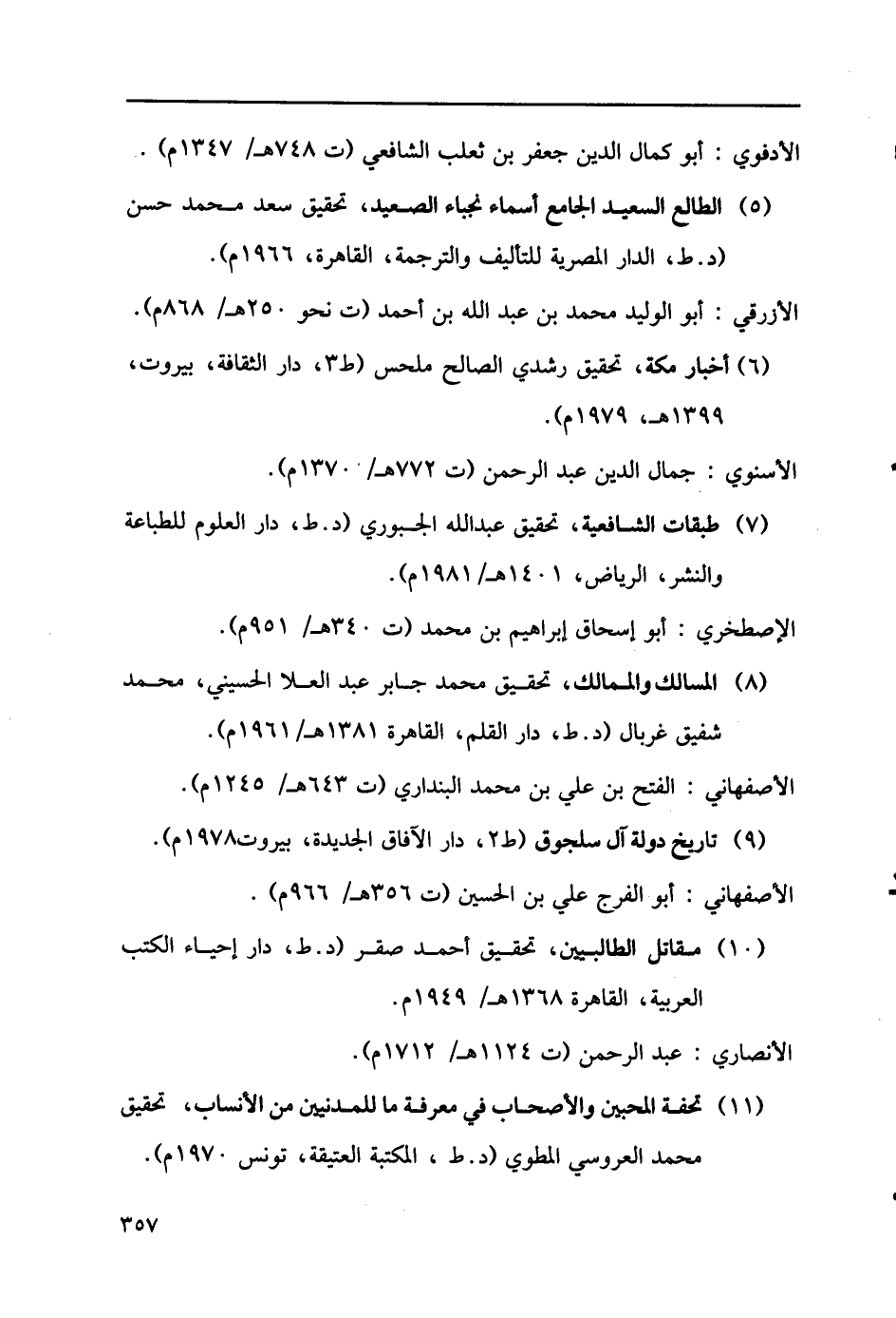 (5) الطالع السعيد الجامع أسماء نجباء الصعيد، تحقيق سعد محمد حسن _د. ط، الدار المصرية للتأليف والترجمة، القاهرة، 1966م). الأزرقي: أبو الوليد محمد بن عبد الله بن أحمد (ت نحو 250هـ/868م). (6) أخبار مكة، تحقيق رشدي الصالح ملحس (ط3، دار الثقابة، بيروت، 1399هـ/ 1979م) الأسنوي: جمال الدين عبد الرحمن (ت 772هـ/ 1370م). (7) طبقات الشافعية، تحقيق عبد الله الجبوري (د. ط، دار العلوم للطباعة والنشر، الرياض، 1410هـ/1981م). الإصطخري: أبو إسحاق إبراهيم بن محمد الجبوري (ت 340هـ/ 951م). (8) المسالك والممالك، تحقيق محمد جابر عبد العلا الحسيني، محمد شفيق غربال (د. ط، دار القلم، القاهرة 1381هـ/ 1961م) الأصفهاني: الفتح بن علي بن محمد البنداري (ت 643هـ/1245). (9) تاريخ دولة آل سلجوق (ط2، دار الآفاق الجديدة، بيروت، 1978م). الأصفهاني: أبو الفرج علي بن الحسين (ت 1124هـ/966م). (10) مقاتل الطالبيين، تحقيق أحمد صقر (د. ط دار إحياء الكتب العربية، القاهرة 1368هـ/1949م. الأنصاري: عبد الرحمن (ت 1124هـ/1712م).