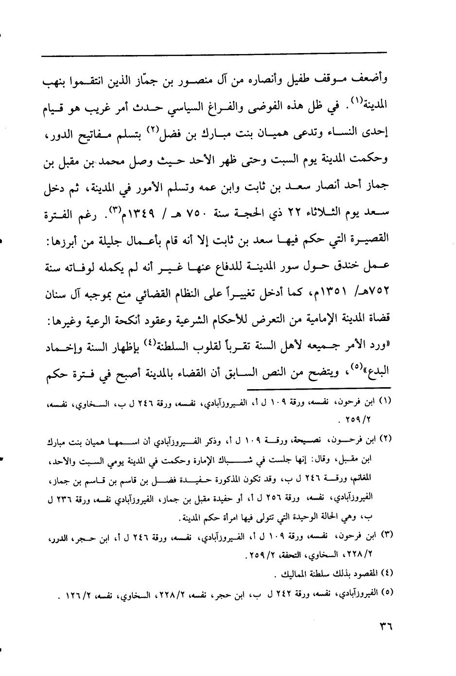 (2) ابن رحون، نصيحة، ورقة 109ل أ، وذكر الفيروزآبادي أن اسمها هميان بنت مبارك ابن مقبل، وقال: إنها جلست في شباك الإمارة وحكمت في المدينة يومي السبت والأحد، المغانم، ورقة 246ل ب، وقد تكون المذكورة حفيدة فضل بن قاسم بن قاسم بن جماز، الفيروزآبادي، نفسه، رقة 256 ل أ، أو حفيدة مقبل بن جماز، الفيروزآبادي نفسه، ورقة 236 ل ب، وهي الحالة الوحيدة التي تتولى فيها امرآة حكم المدينة.