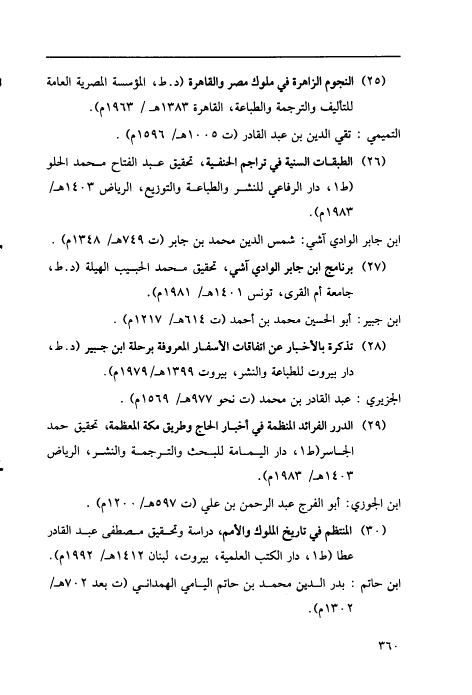 (26) الطبقات السنية في تراجم الحنفة، تحقيق عبد الفتاح محمد الحلو (ط1، دار الرفاعي لنشر والطباعة والتوزيع، الرياض 1403هـ/1983م). ابن جابر الوادي آشي: شمس الدين محمد بن جابر (ت 749هـ/ 1348م). (27) برنامج ابن جابر الوادي آشي، تحقيق محمد الحبيب الهيلة (د. ط، جامعة أم القرى، تونس 1401هـ/ 1981م). ابن جبير: أبو الحسين محمد بن أحمد (ت614هـ/ 1217م). (28) تذكرة بالأخبار عن اتفاقات الأسفار المعروفة برحلة ابن جبير (د. ط، دار بيروت للطباعة والنشر، بيروت 1399هـ/ 1569م). الجزيري: عبدالقادر بن محمد (ت نحو 977هـ/1569م). (29) الدرر الفرائد المنظمة في أخبار الحاج وطريق مكة المعظمة، تحقيق حمد الجاسر (ط1، دار اليمامة للبحث والترجمة والنشر، الرياض 1403هـ/1983م). ابن الجوزي: أبو الفرج عبد الرحمن بن علي (ت 597هـ/1200م).