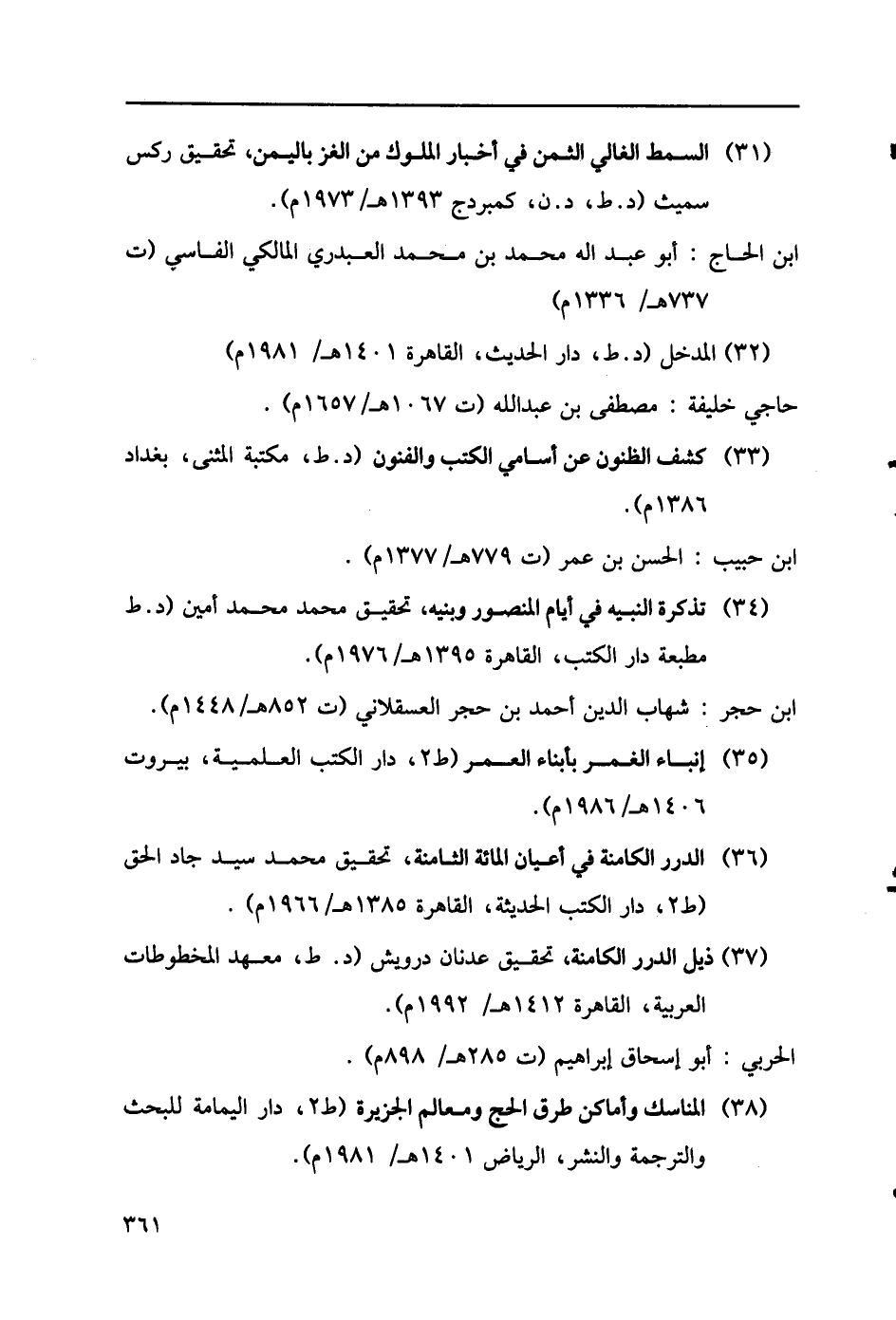 ابن الحاج: أبو عبد اله محمد بن محمد العبدري المالكي الفاسي (ت 737هـ/1336م) (32) المدخل (د. ط، دار الحديث، القاهرة 1401هـ/1981م) حاجي خليفة: مصطفى بن عبدالله (ت1067هـ/1657م) (33) كشف الظنون عن أسامي الكتب والفنون (د. ط، مكتبة المثنى، بغداد 1386م) ابن حجر: شهاب الدين أحمد بن حجر العسقلاني (ت852هـ/1448م). (34) تذكرة النبيه في أيام المنصور وبنيه، تحقيق محمد محمد أمين (د. ط مطبعة دار الكتب، القاهرة 1395هـ/1448م). (35) إنباء الغمر بأبناء العمر (ط2، دار الكتب العلمية، بيروت 1406هـ/1986م). (36) الدرر الكامنة، تحقيق محمد سيد جاد الحق (ط2، دار الكتب الحديثة، القاهرة 1385هـ/1966م). (37) ذيل الدرر الكامنة، تحقيق عدنان درويش (د. ط، معهد المخطوطات العربية، القاهرة 1412هـ/1992م). الحربي: أبو إسحاق إبراهيم (ت 285هـ/898م).