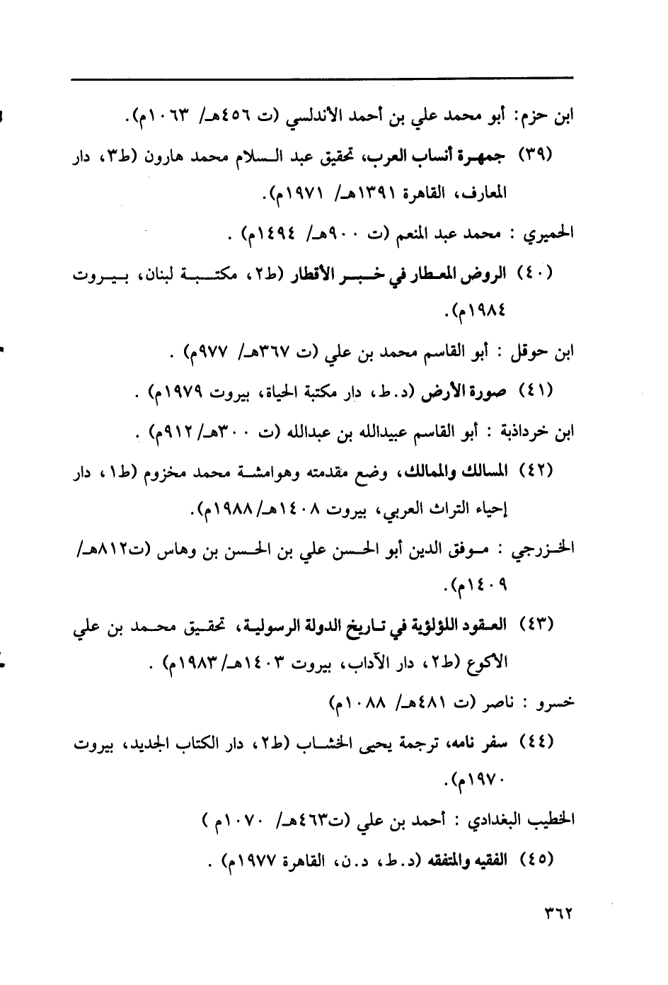 (39) جمهرة أنساب العرب، تحقيق عبد السلام محمد هارون (ط3، دار المعارف، القاهرة 1391هـ/1971م). الحميري: محمد عبد المنعم (ت 900هـ/1494م). (40) الروض المعطار في خبر الأقطار (ط2، مكتبة لبنان، بيروت 1974م). ابن حوقل: أبو القاسم محمد بن علي (ت 367هـ/977م). (41) صورة الأرض (د. ط، دار مكتبة الحياة، بيروت 1979م). ابن خرداذبة: أبو القاسم عبيد الله بن عبد الله (ت300هـ/912م). (42) المسالك والممالك، وضع مقدمته وهوامشة محمد مخزوم (ط1، دار إحياء التراث العربي، بيروت1408هـ/1988م). الخزرجي: موفق الدين أبو الحسن علي بن الحسن بن وهاس (ت812هـ/1409م). (43) العقود اللؤلؤية في تاريخ الدولة الرسولية، تحقيق محمد بن علي الأكوع (ط2، دار الآداب، بيروت 1403هـ/1983م). خسرو: ناصر (ت481هـ/1088م). (44) سفر نامه، ترجمة يحيى الخشاب (ط2، دار الكتاب الجديد، بيروت 1970م). الخطيب البغدادي: أحمد بن علي (ت 463هـ/1070م)