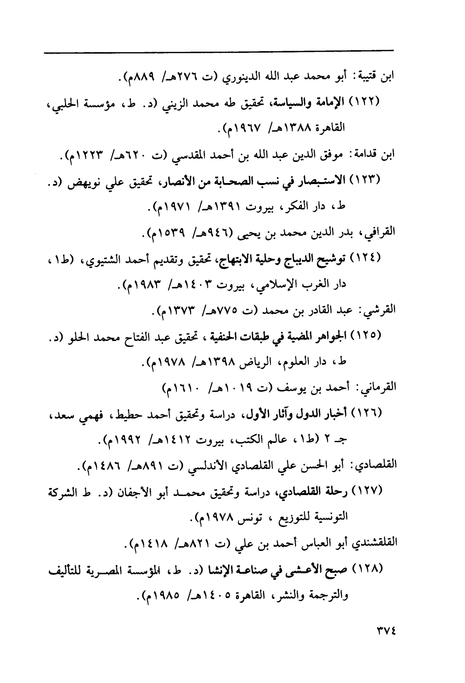 (122) الإمامة والسياسية، تحقيق طه محمد الزيني (د. ط، مؤسسة الحلبي، القاهرة 1388هـ/1967م). ابن قدامة: موفق الدين عبد الله بن أحمد المقدسي (ت620هـ/1223م). (123) الاستبصار في نسب الصحابة من الأنصار، تحقيق علي نويهض (د. ط، دار الفكر، بيروت1391هـ/1917م). القرافي، بدر الدين محمد بن يحيى (946هـ/1539م). (124) توشيح الديباج وحلية الابتهاج، تحقيق وتقديم أحمد الشتيوي، (ط1، دار المغرب الأسلامي، بيروت 1403هـ/1983م). القرشي: عبد القادر بن محمد (ت775هـ/1373م). (125) الجواهر المضية في طبقات الحنفية، بحقيق عبد الفتاح محمد الحلو (د. ط، دار العلوم، الرياض 1398هـ/1983م). القرماني: أحمد بن يوسف (ت1019هـ/1610م). (126) أخبار الدول وآثار الأول، دراسة وتحقيق أحمد حطيط، فهمي سعد، جـ2 (ط1، عالم الكتب، بيروت 1412هـ/1992م). القصادي: أبو الحسن علي القلصادي الأندلسي (ت 891هـ/1486م). (127) رحلة القلصادي، دراسة وتحقيق محمد أبو الأجفان (د. ط الشركة التونسية للتوزيع، تونس 1978م). القلقشيدي أبو العباس أحمد بن علي (ت821هـ/1418م).