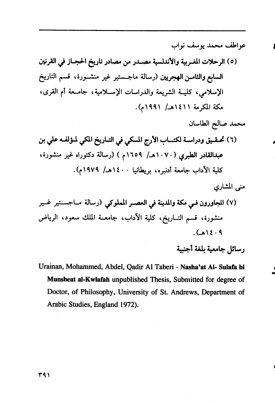 (6) تحقيق ودراسة لكتاب الأرج المسكي في التاريخ المكي لمؤلفه علي بن عبد القادر الطبري (1070هـ/1659م) (رسالة دكتوراه غير منشورة، كلية الآداب جامعة أدنبره، بريطانيا 1400هـ/1979م).