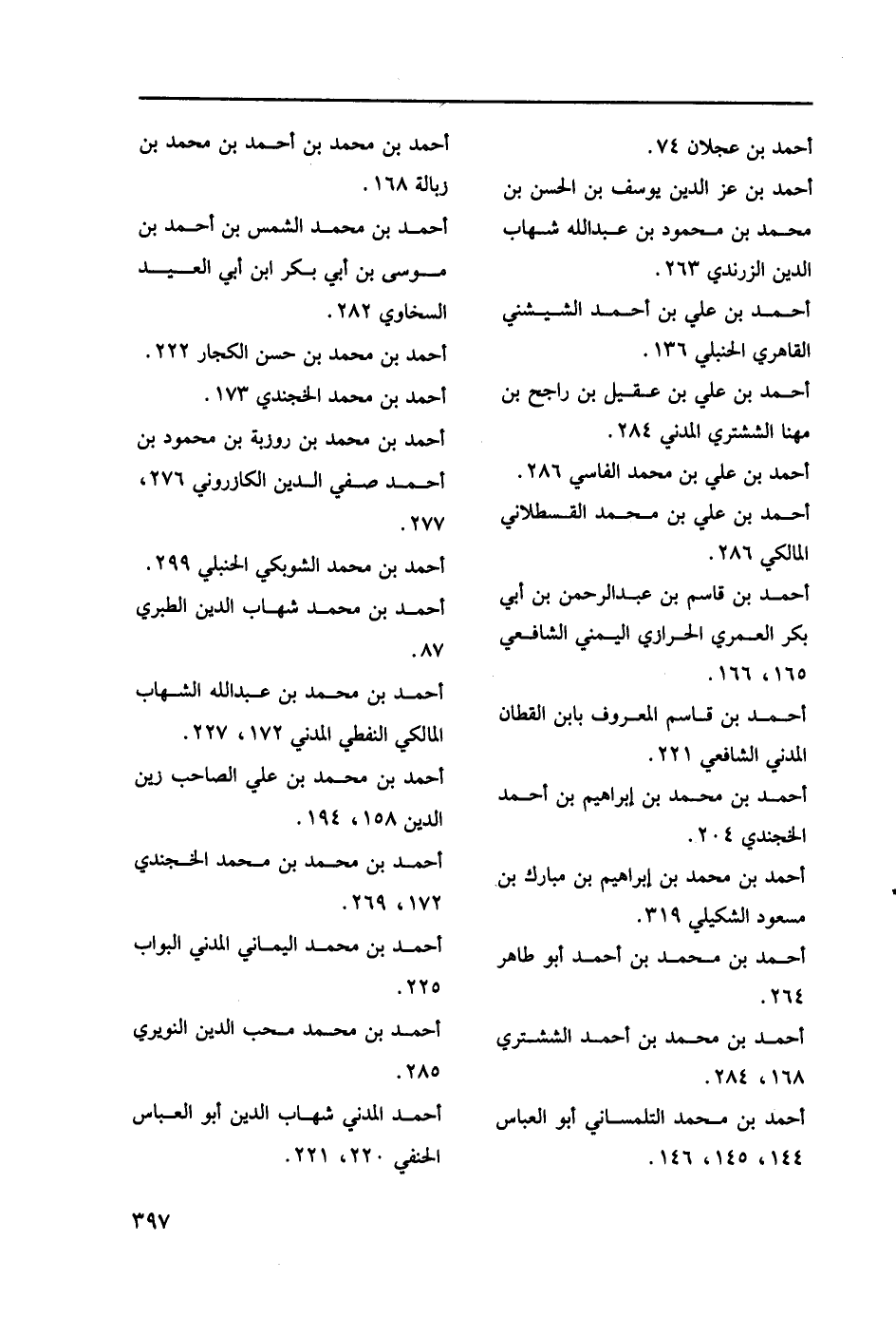 أحمد بن عز الدين يوسف بن الحسن بن محمد بن محمود بن عبد الله شهاب الدين الزرندي 263. أحمد بن علي بن أحمد الشيشني القاهري الحنبلي 136. أحمد بن علي بن عقيل بن راجح بن مهنا الششتري المدني 284. أحمد بن علي بن محمد الفاسي286. أحمد بن علي بن محمد القسطلاني المالكي 286. أحمد بن قاسم بن عبد الرحمن بن أبي بكر العمري الحرازي اليمني الشافعي 165، 166. أحمد بن قاسم المعروف بابن القطان المدني الشافعي 221. أحمد بن محمد بن إبراهيم بن أحمد الخجندي 204. أحمد بن محمد بن إبراهيم بن مبارك بن مسعود الشكيلي 319. أحمد بن محمد بن أحمد أبو طاهر 264. أحمد بن محمد بن أحمد الششتري 168، 284. أحمد بن محمد بن التلمساني أبو العباس 144، 145، 146. أحمد بن محمد بن أحمد بن محمد بن زبالة 168. أحمد بن محمد الشمس بن أحمد بن موسى بن أبي بكر ابن أبي العيد السخاوي 282 أحمد بن محمد بن حسن الكجار 222. أحمد بن محمد الخجندي 173. أحمد بن محمد بن روزبة بن محمود بن أحمد صفي الدين الكازروني 276، 277. أحمد بن محمد بن شهاب الدين الطبري 87. أحمد بن محمد بن عبد الله الشهاب المالكي النفطي المدني 172، 227. أحمد بن محمد بن علي الصاحب زين الدين 158، 194. أحمد بن محمد بن محمد الخجندي 172، 269. أحمد بن محمد اليماني المدني البواب 225. أحمد بن محمد محب الدين النويري 258.