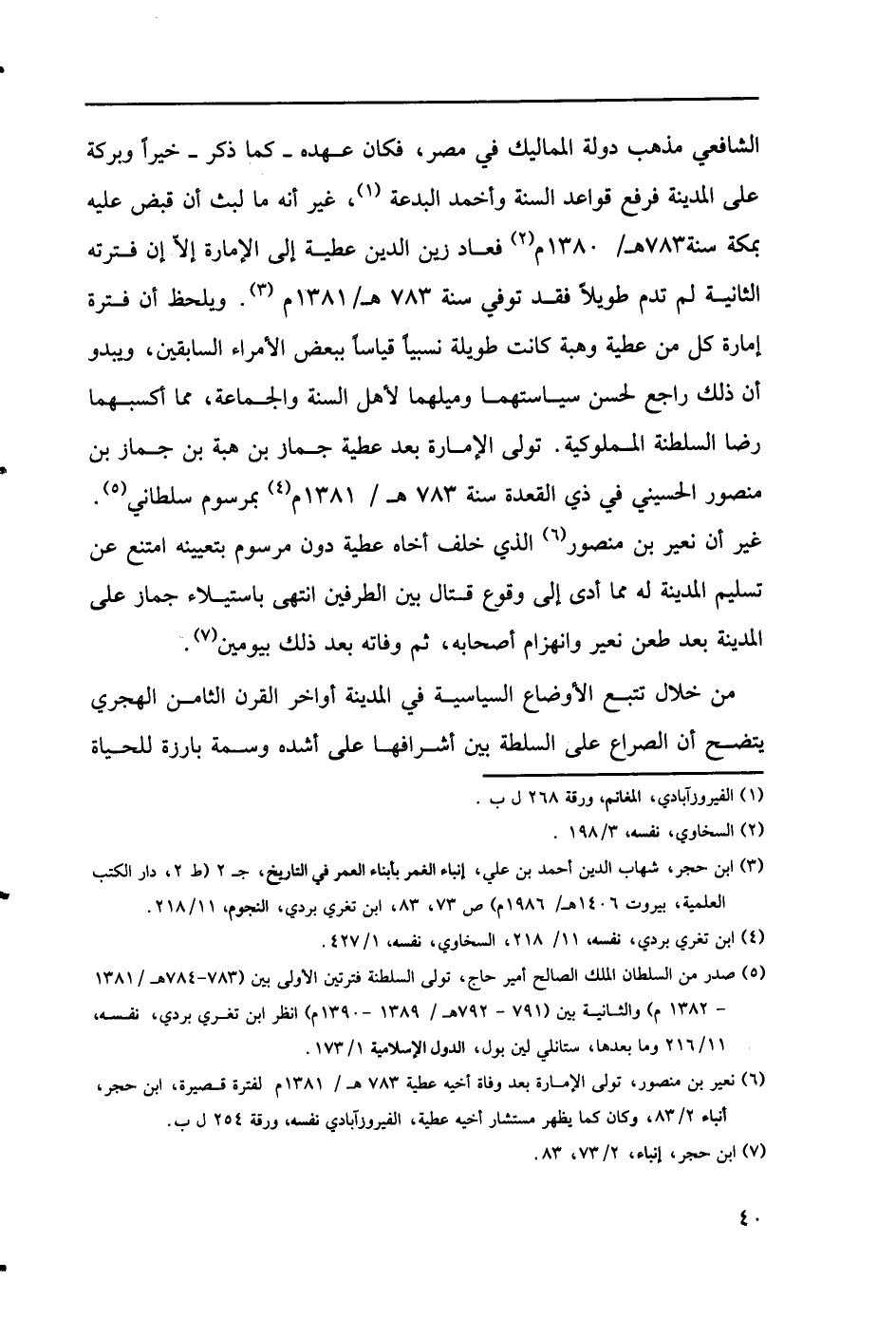 (6) نعير بن منصور، تولى الإمارة بعد وفاة أخيه عطية 783هـ/1381م لفترة قصيرة، ابن حجر، أنباء 83/ 2، وكان كما يظهر مستشار أخيه عطية، الفيروزآبادي نفسه، ورقة 254 ل ب.
