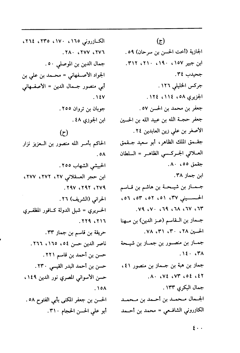 ابن جبير 157، 190، 210، 312. جحيدب34. جركس الخليلي 126. الجزيري 58، 114، 124. جعفر بن محمد بن الحسن 57. جعفر بن حجة الله بن عبيد الله بن الحسين الأصغر بن علي زين العابدين 24. جقمق الملك الظاهر، أبو سعيد جقمق العلائي الجركسي الظاهر= السلطان جقمق 55، 80. ابن جماز 38. جماز بن شيحة بن هاشم بن قاسم الحسيني 37، 51، 52، 53، 56، 63، 67، 69، 70، 79. جماز بن القاسم (عز الدين) بن مهنا الحسين 28، 30، 31، 78. جماز بن منصور بن جماز بن شيحة 38، 140. جماز بن هبة بن جماز بن منصور 41، 42، 54، 73، 74، 80. جمال البكري 133. الجمال محمد بن أحمد بن محمد الكازروني الشافعي = محمد بن أحمد الكازروني 165، 170، 235، 264، 276، 277، 280. جمال الدين بن الموصلي 50. الجواد الأصفهاني = محمد بن علي بن أبي منصور جمال الدين = الأصفهاني 147. جوبان بن تروان 255. ابن الجوزي 48.