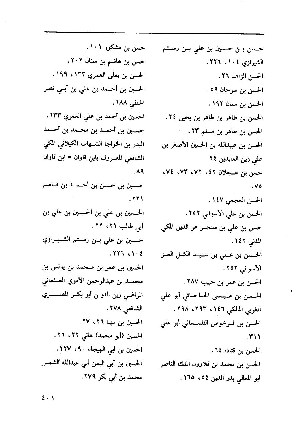 الحسن الزاهد 26. الحسن بن سرحان 59. الحسن بن سنان 192. الحسن بن طاهر بن طاهر بن يحيى 24. الحسن بن طاهر بن مسلم 23. الحسن بن عبيد الله بن الحسين الأصغر بن علي زين العابدين 24. حسن بن عجلان 42، 72، 73، 74، 75. الحسن العجمي 147. الحسن بن علي الأسواني 252. حسن بن علي بن سنجر عز الدين المكي المدني 142. الحسن بن علي بن سيد الكل العز الأسواني 252. الحسن بن عمر بن حبيب 287. الحسن بن عيسى الحاحائي أبو علي المغربي المالكي 146، 293، 298. الحسن بن فرخوص التلمساني أبو علي 311. الحسن بن قتادة 64. الحسن بن محمد بن قلاوون الملك الناصر أبو المعالي بدر الدين 54، 165. حسن بن مشكور 101. حسن بن هاشم بن سنان 202. الحسن بن يعلى العمري 133، 199. الحسين بن أحمد بن علي بن أبي نصر الحنفي 188. الحسين بن أحمد بن علي العمري 133. حسين بن أحمد بن محمد بن أحمد البدر بن الخواجا الشهاب الكيلاني المكي الشافعي المعروف بابن قاوان- اب قاوان 89. حسين بن حسن بن أحمد بن قاسم 221. الحسين بن علي بن الحسين بن علي بن أبي طالب 21، 22. الحسين بن عمر بن محمد بن يونس بن محمد بن عبد الرحمن الأموي العثماني المراغي زين الدين أبو بكر المصري الشافعي 278. الحسين بن مهنا 26، 27. الحسين (أبو محمد) هاني 22، 26. الحسين بن أبي الهيجاء 90، 227.