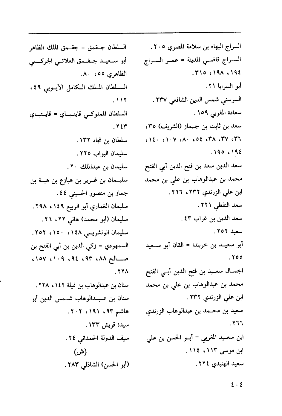 السراج البهاء بن سلامة المصري 205. السراج قاضي المدينة = عمر السراج 184، 198، 315. أبو السرايا 21. السرسني شمس الدين الشافعي 237. سعادة المغربي 159. سعد بن ثابت بن جماز (الشريف) 35، 36، 37، 38، 54، 80، 107، 140، 194، 195. سعد الدين بن فتح الدين أبي الفتح محمد بن عبد الوهاب بن علي بن حمد ابن علي الزرندي 232، 266. سعد النفطي 221. سعد الدين بن غراب 43. سعيد 252 أبو سعيد بن خربندا =القان أبو سعيد 255. الجمال سعيد بن فتح الدين أبي الفتح محمد بن عبد الوهاب بن علي بن محمد ابن علي الزرندي 232. سعيد بن محمد بن عبد الوهاب الزرندي 266. ابن سعيد المغربي = أبو الحسن بن علي ابن موسى 113، 114. سعيد الهنيدي 224. السلطان جقمق = جقمق الملك لظاهر أبو سعيد جقمق العلائي الجركسي الظاهري 55، 80. السلطان الملك الكامل الأيوبي 49، 112. السلطان المملوكي قايتباي = قايتباي 243. سلطان بن نجاد 132 سليمان البواب 225. سليمان بن عبد الملك 20. سليمان بن غرير بن هيازع بن هبة بن جماز بن منصور الحسيني 44. سليمان الغماري أبو الربيع 149، 298. سليمان (أبو محمد) هاني 22، 26. سليمان الونشريسي 148، 150، 252. السمهودي = زكي الدين بن أبي الفتح بن صالح 88، 93، 94، 109، 157، 228. سنان بن عبد الوهاب بن نميلة 142، 228. سنان بن عبد الوهاب شمس الدين أبو هاشم 93، 191، 202. سيدة قريش 133. سيف الدولة الحمداني 24.