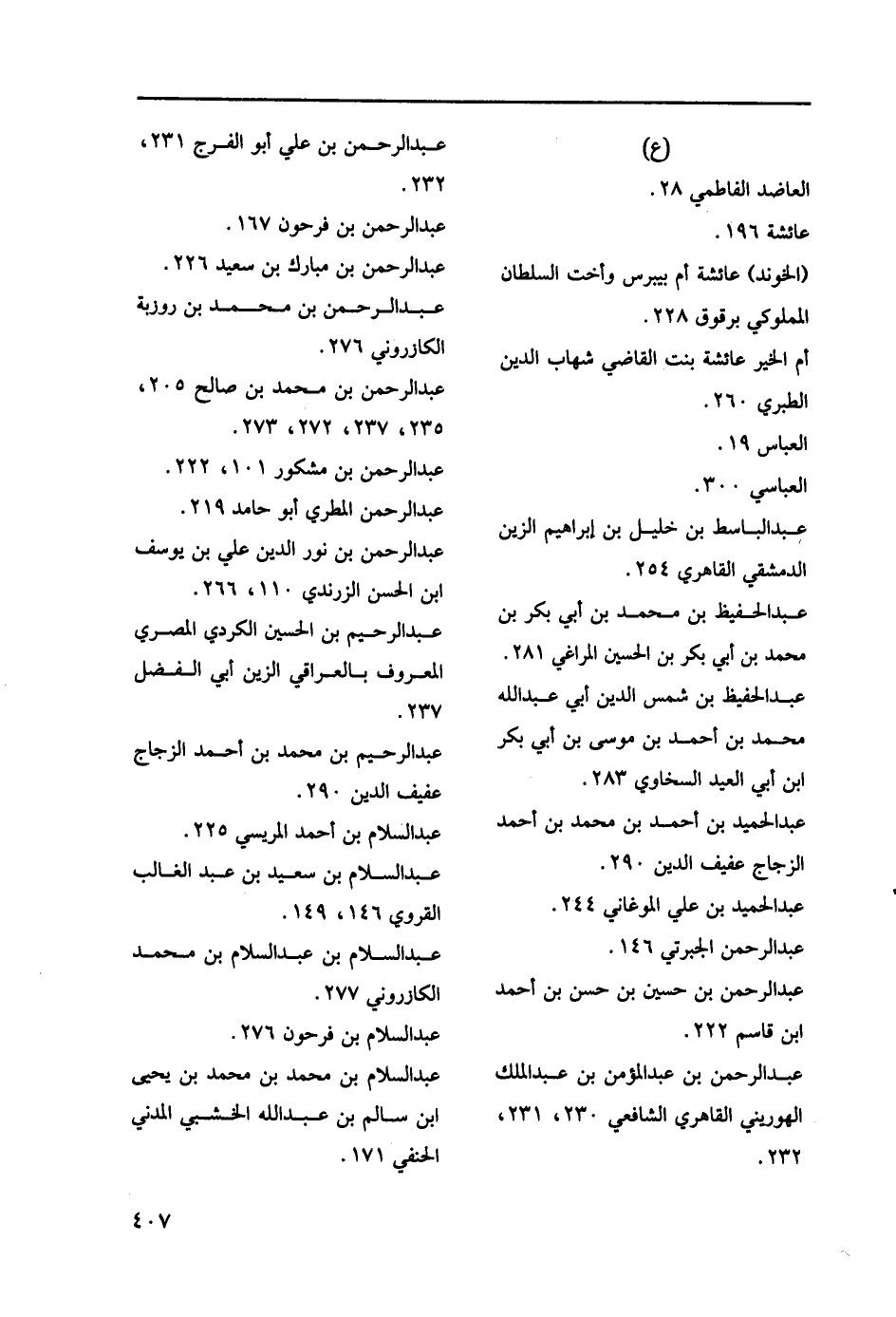 (ع) العضد الفاطمي 28. عائشة 196. (الخوند) عائشة أم بيبرس وأخت السلطان المملوكي برقوق 228. أم الخير علئشة بنت القاضي شهاب الدين الطبري 206. العباس 19. العباسي 300. عبد الباسط بن خليل بن إبراهيم الزين الدمشقي القاهري 254. عبد الحفيظ بن محمد بن أبي بكر بن محمد بن أبي بكر بن الحسين المراغي 281. عبد الحفيظ بن شمس الدين أبي عبد الله محمد بن أحمد بن موسى بن أبي بكر ابن أبي العيد السخاوي 283. عبد الحميد بن أحمد بن محمد بن أحمد الزجاج عفيف الدين 290. عبد الحميد بن علي الموغاني 244. عبد الرحمن الجبرتي 146. عبد الرحمن بن حسين بن حسن بن أحمد ابن قاسم 222. عبد الرحمن بن عبد المؤمن بن عبد الملك الهوريني القاهري الشافعي 230، 231، 232. عبد الرحمن بن علي أبو الفرج 231، 232. عبد الرحمن بن فرحون 167. عبد الرحمن بن مبارك بن سعيد 226. عبد رحمن بن محمد بن روزبة الكازروني 276. عبد الرحمن بن محمد بن صالح 205، 235، 237، 272، 273. عبد الرحمن بن مشكور 101، 222. عبد الرحمن المطري أبو حامد 219. عبد الرحمن بن نور الدين علي بن يوسف ابن الحسن الزرندي 110، 266. عبد الرحيم بن الحسين الكردي المصري المعروف بالعراقي الزين أبي الفضل 237. عبد الرحيم بن محمد بن أحمد الزجاج عفيف الدين 290. عبد السلام بن سعيد بن عبد الغالب القروي 146، 149. عبد السلام بن عبد السلام بن محمد الكازروني 277. عبد السلام بن فرحون 276. عبد السلام بن محمد بن محمد بن يحيى ابن سالم بن عبد الله الخشبي المدني الحنفي 171.…