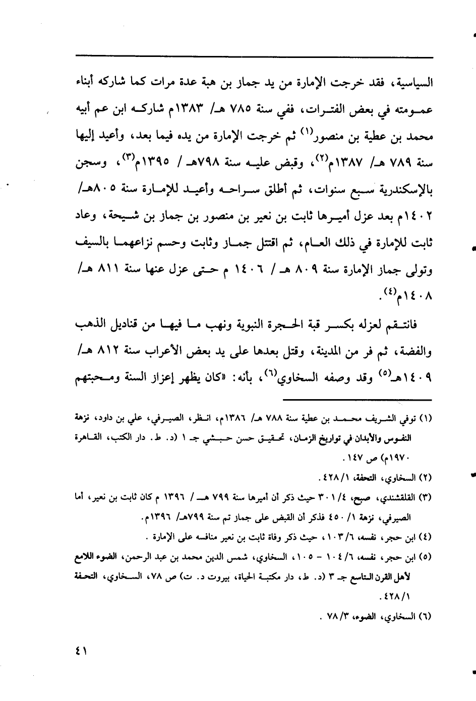 (3) القلقشندي، صبح، 301/ 4حيث ذكر أن أميرها سنة 799هـ/1396م كان ثابت بن نعير، أما الصيرفي، نزهة 450/ 1فذكر أن القبض على جماز تم سنة 799هـ/1396م.