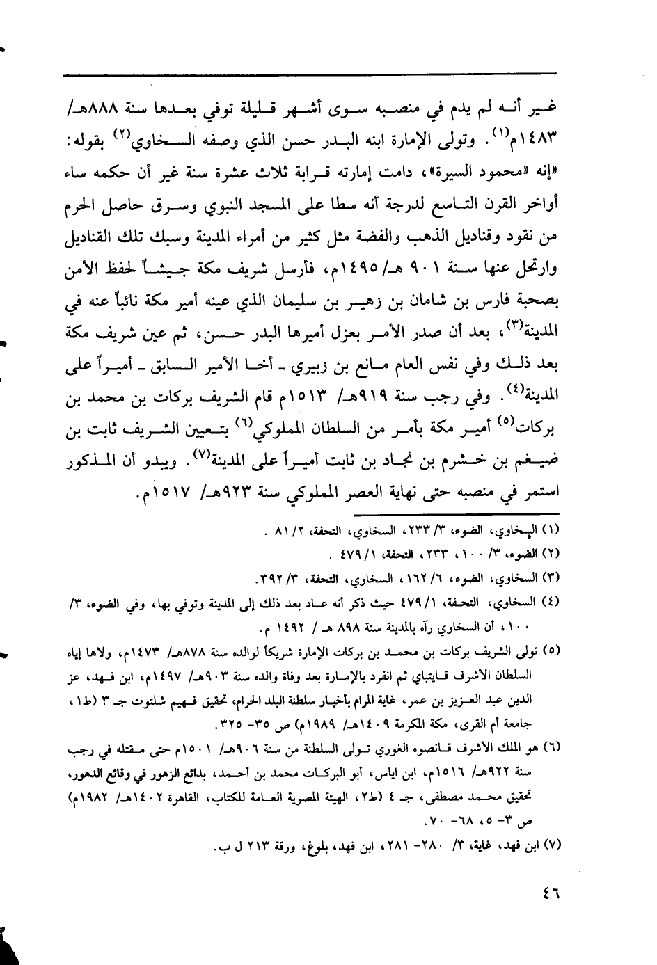 (5) تولى الشريف بركات بن محمد بن بركات الإمارة شريكاً لوالده سنة 878هـ/1473م، ولاها إياه السلطان الأشرف قايتباي ثم انفرد بالإمارة بعد وفاة والده سنة 903هـ/1497م، ابن فهد، عز الدين عبد العزيز بن عمر، غاية المرام بأخبار سلطنة البلد الحرام، تحقيق فهيم شلتوت جـ3 (ط1، جامعة أم القرى، مكة المكرمة 1409هـ/1989م) ص 35 - 325.