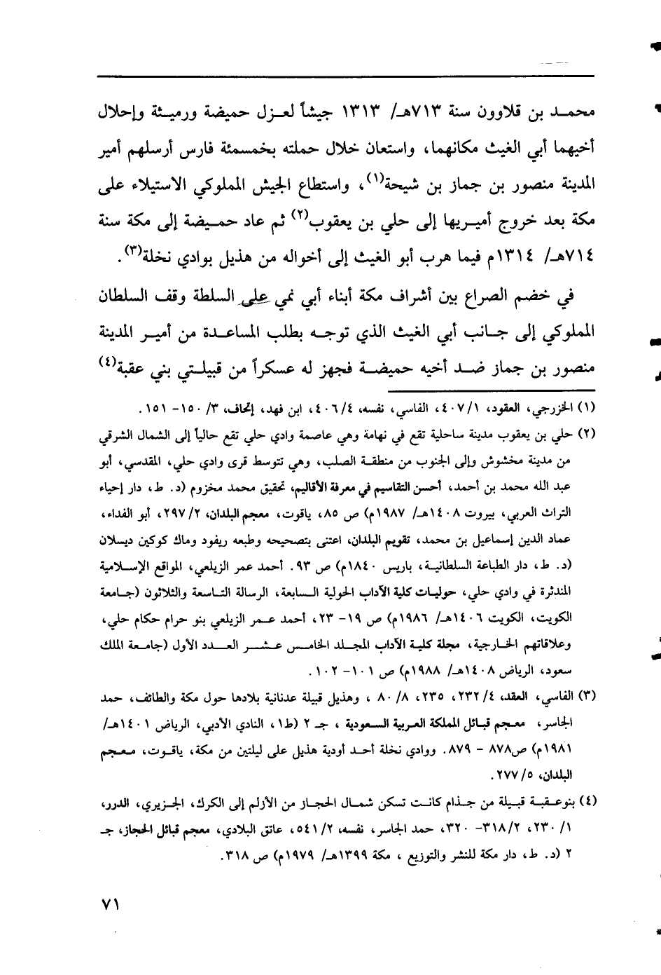 (3) الفاسي، العقد، 232/ 4، 135، 80/ 8، وهذيل قبيلة عدنانية بلادها حول مكة والطائف، حمد الجاسر، معجم قبائل المملكة العربية السعودية، جـ2 (ط1، النادي الادبي، الرياض، 1401هـ/1981م) ص 878 - 879 وادي نخلة أحد أودية هذيل على ليلتين من مكة، ياقوت، معجم البلدان، 277/ 5.