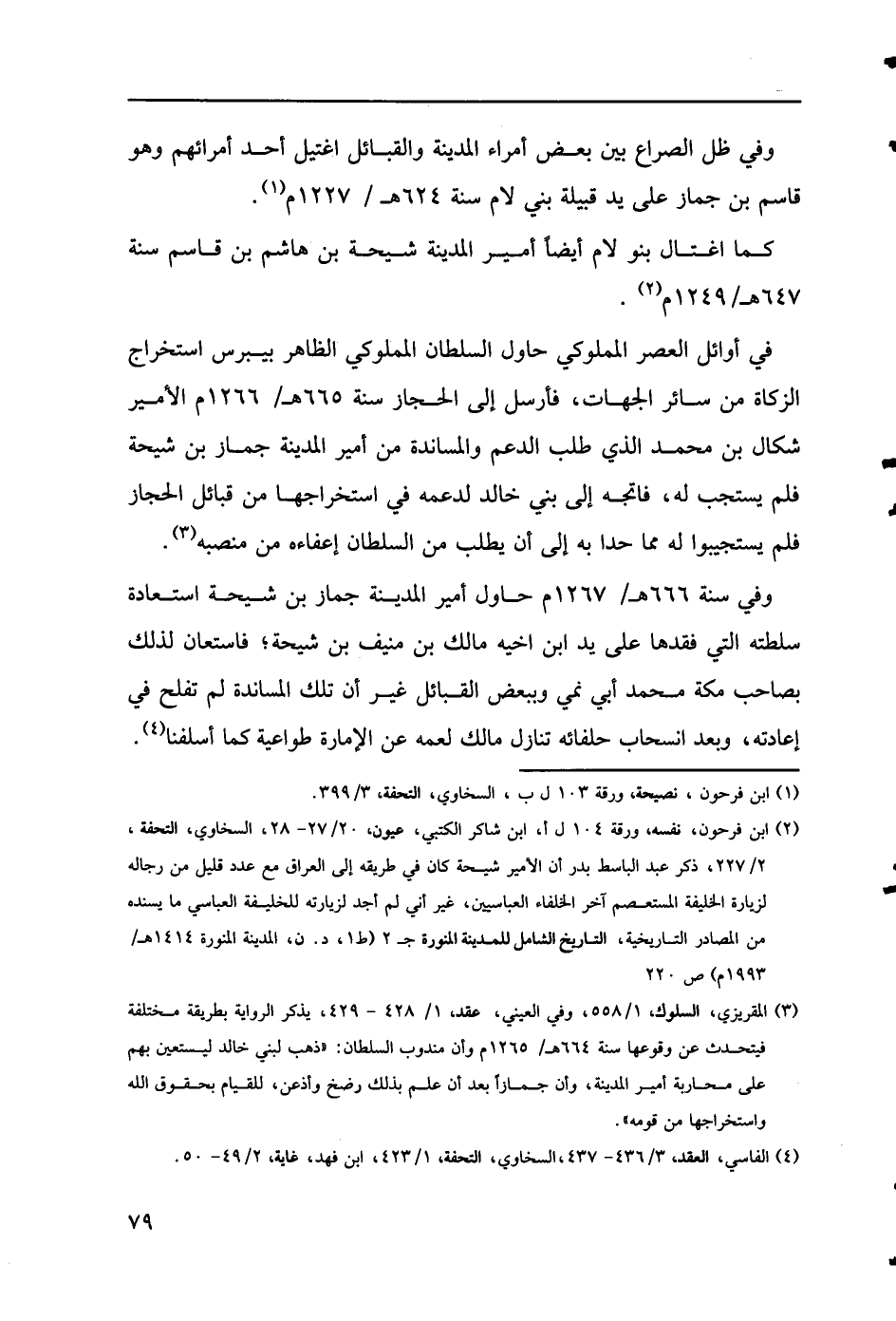 (3) المقريزي، السلوك، 558/ 1، وفي العيني، عقد، 428/ 1 - 429، يذكر الرواية بطريقة مختلفة فيتحدث عن وقوعها سنة 664هـ/1265م وأن مندوب السلطان: "ذهب لبني خالد ليستعين بهم على محاربة أمير المدينة، وأن جمازاً بعد أن علم بذلك رضخ وأذعن، للقيام بحقوق الله واستخراجها من قومه".