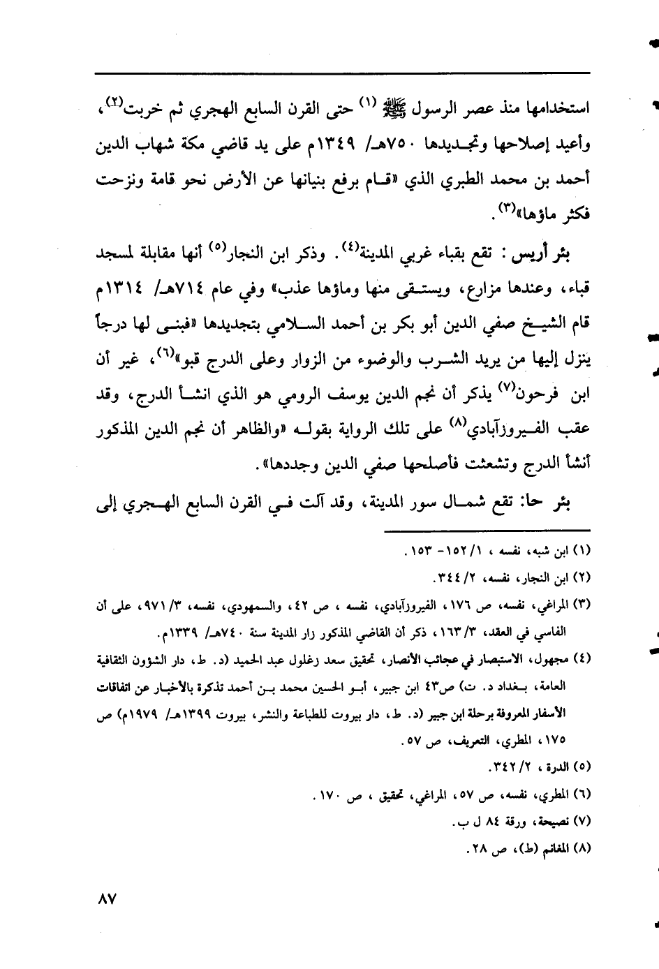 (3) المراغي، نفسه، ص 176، الفيروزآبادي، نفسه، ص 42، والسمهودي، نفسه، 3/ 971، على أن الفاسي في العقد، 3/ 163، ذكر أن القاضي المذكور زار المدينة سنة 740هـ/ 1339م.