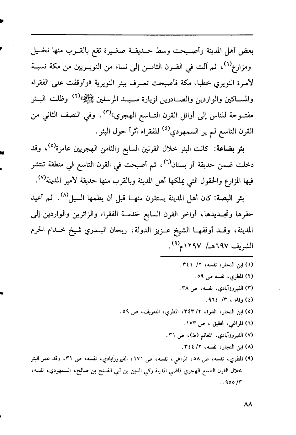 (9) المطري، نفسه، ص58، المراغي، نفسه، ص 171، الفيروزآبادي، نفسه، ص 31، وقد عمر البئر خلال القرن التاسع الهجري قاضي المدينة زكي الدين بن أبي الفتح بن صالح، السمهودي، نفسه، 3/ 955.