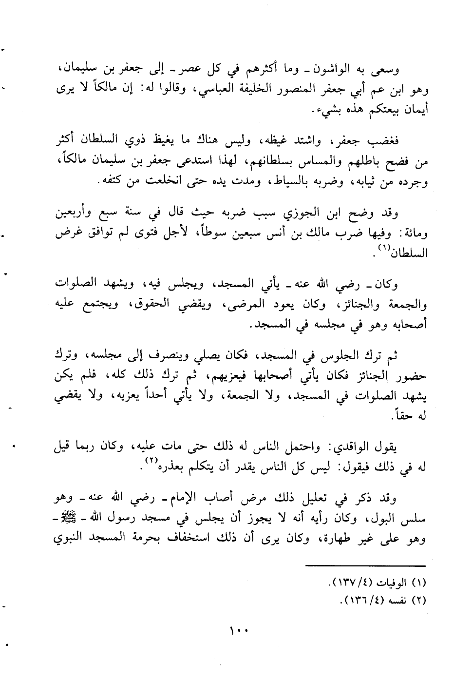 ومائة: وفيها ضرب مالك بن انس سبعين سوطا، لأجل فتوى لم توافق غرض