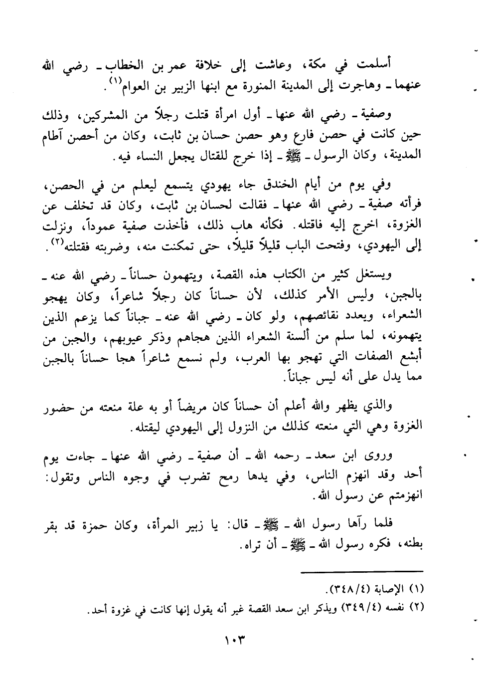 فراته صفية - رضي الله عنها- فقالت لحسان بن تابت، وكان قد تخلف عن