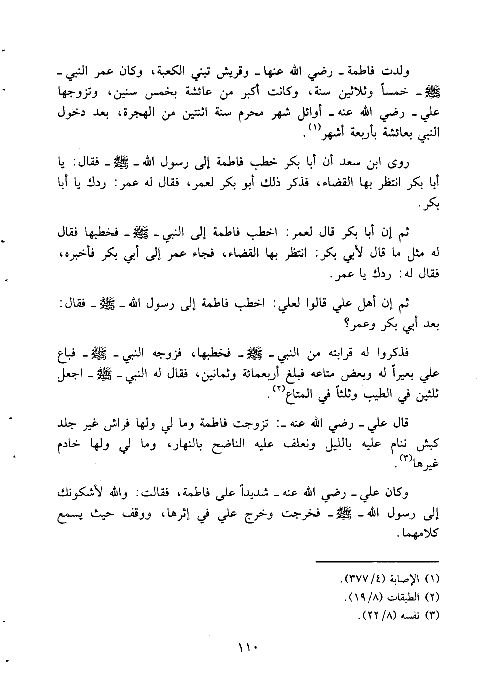 روى ابن سعد أن ابا بكر خطب فاطمة إلى رسول الله - صلى الله عليه وسلم - فقال: يا