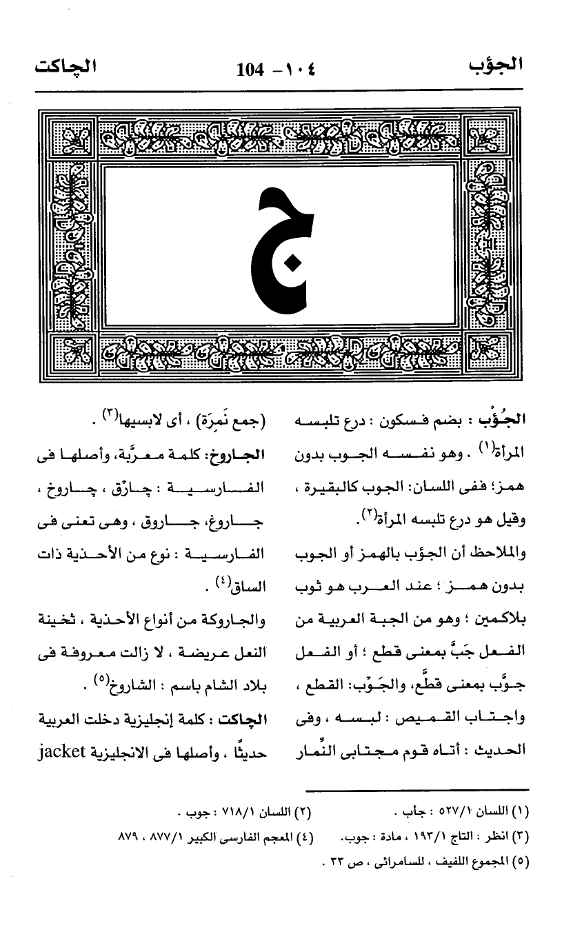 والملاحظ أن الجؤب بالهمز أو الجوب بدون همز؛ عند العرب هو ثوب بلا كمين؛ وهو من الجبة العربية من الفعل جَبَّ بمعنى قطع؛ أو الفعل جوَّب بمعنى قطَّع، والجَوْب: القطع، واجتاب القميص: لبسه، وفى الحديث: أتاه قوم مجتابى النِّمار (جمع نَمِرَة)، أى لابسيها (¬3).