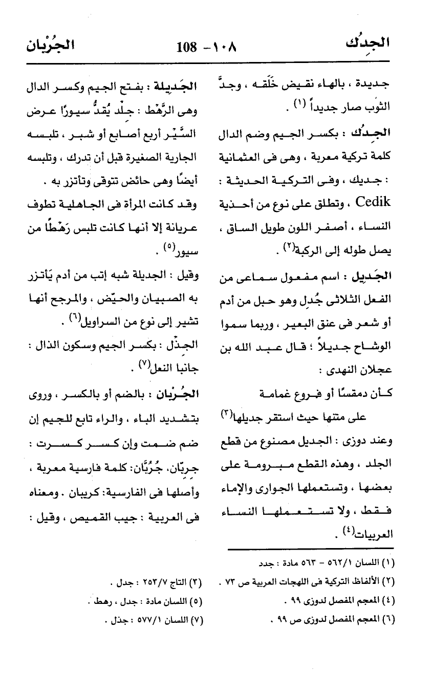 الجِدُك: بكسر الجيم وضم الدال كلمة تركية معربة، وهى في العثمانية: جديك، وفى التركية الحديثة: Cedik، وتطلق على نوع من أحذية النساء، أصفر اللون طويل الساق، يصل طوله إِلى الركبة (¬2).