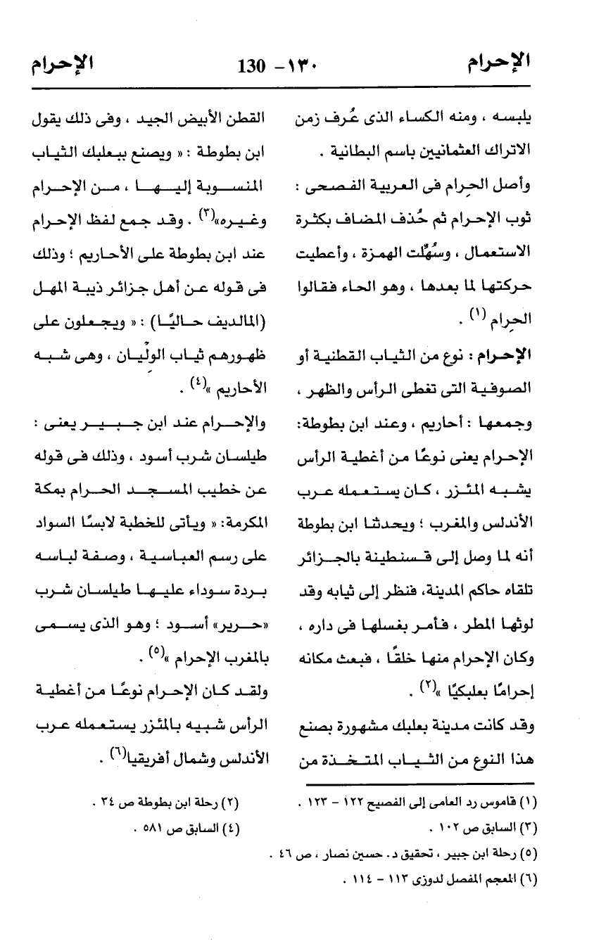 وقد كانت مدينة بعلبك مشهورة بصنع هذا النوع من الثياب المتخذة من القطن الأبيض الجيد، وفى ذلك يقول ابن بطوطة: "ويصنع ببعلبك الثياب المنسوبة إليها، من الإحرام وغيره" (¬3). وقد جمع لفظ الإحرام عند ابن بطوطة على الأحاريم؛ وذلك في قوله عن أهل جزائر ذيبة المهل (المالديف حاليًا): "ويجعلون على ظهورهم ثياب الوِلْيان، وهى شبه الأحاريم" (¬4).