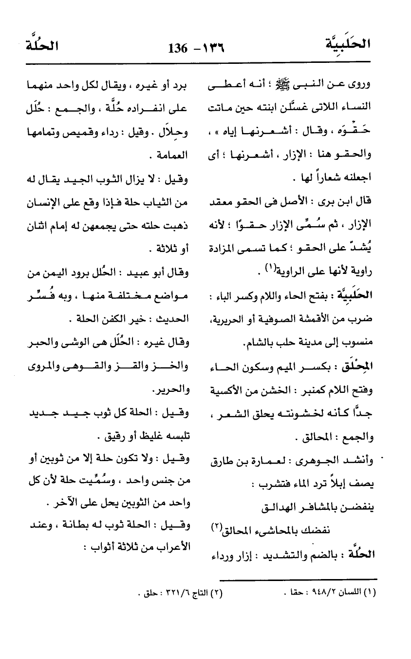الحُلَّة: بالضم والتشديد: إزار ورداء برد أو غيره، ويقال لكل واحد منهما على انفراده حُلَّة، والجمع: حُلَل وحِلَال. وقيل: رداء وقميص وتمامها العمامة.
