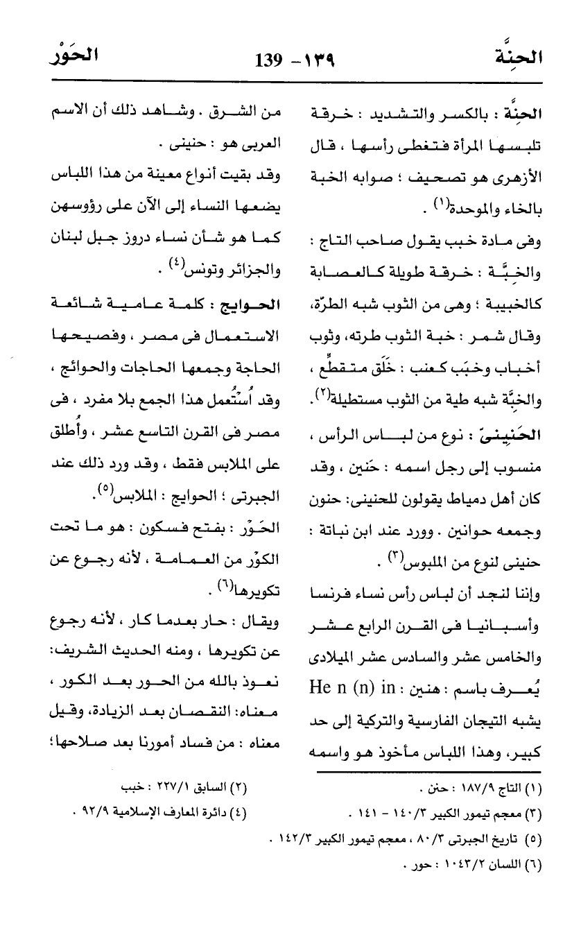وإننا لنجد أن لباس رأس نساء فرنسا وأسبانيا في القرن الرابع عشر والخامس عشر والسادس عشر الميلادى يُعرف باسم: هنين: Hen(n)in يشبه التيجان الفارسية والتركية إلى حد كبير، وهذا اللباس مأخوذ هو واسمه من الشرق. وشاهد ذلك أن الاسم العربى هو: حنينى.