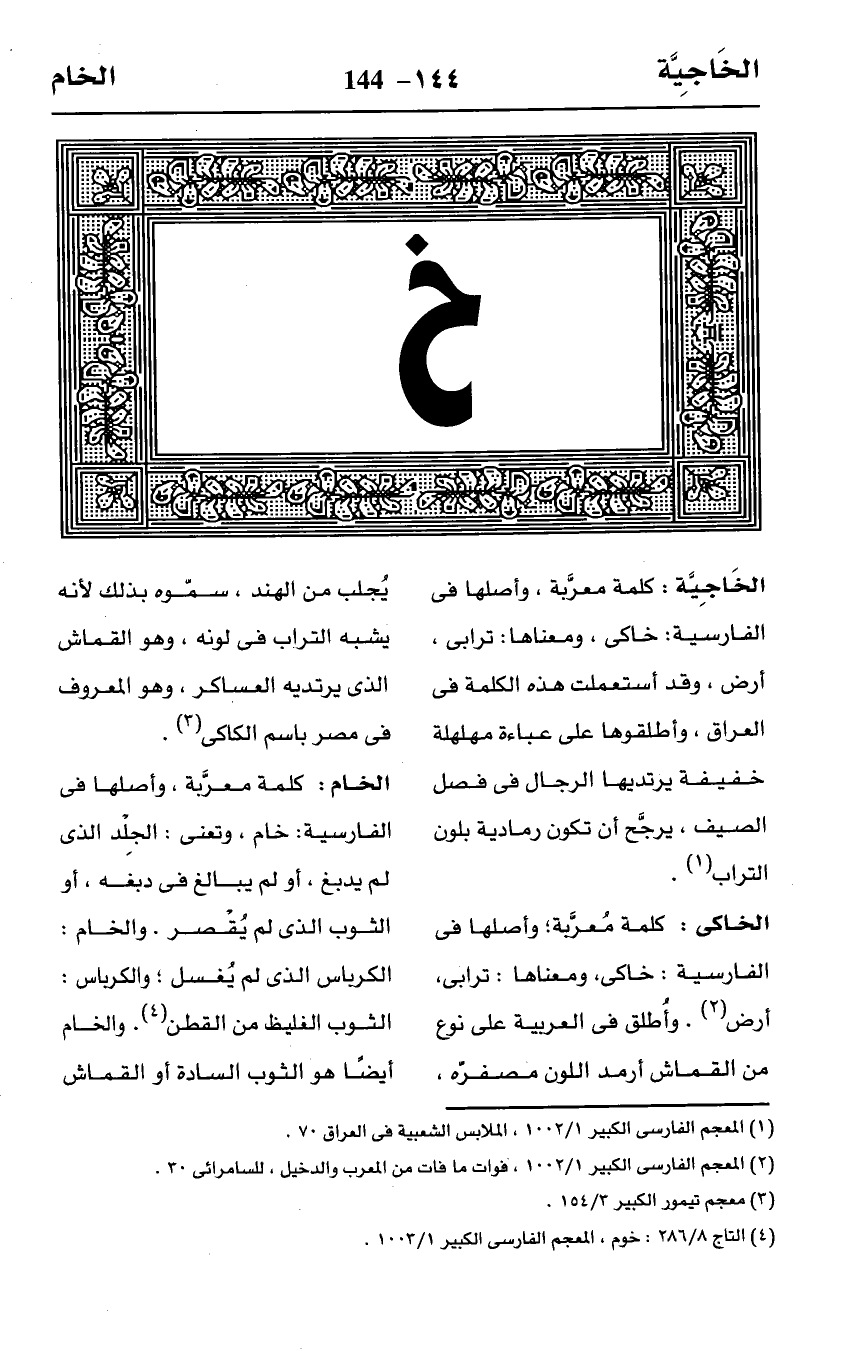 الخاكى: كلمة مُعرَّبة؛ وأصلها في الفارسية: خاكى، ومعناها: ترابى، أرض (¬2). وأُطلق في العربية على نوع من القماش أرمد اللون مصفرّه، يُجلب من الهند، سمّوه بذلك لأنه يشبه التراب في لونه، وهو القماش الذى يرتديه العساكر، وهو المعروف في مصر باسم الكاكى (¬3).