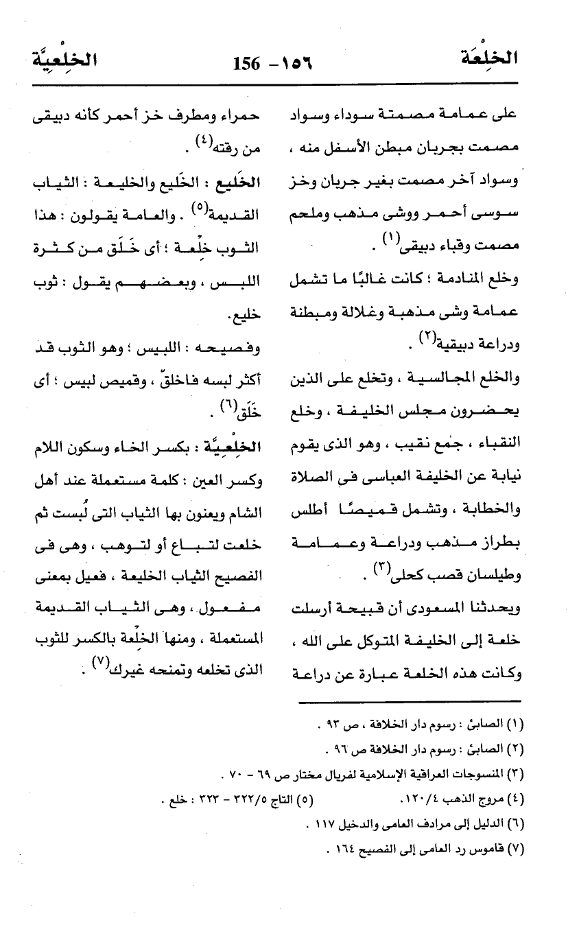 الخِلْعِيَّة: بكسر الخاء وسكون اللام وكسر العين: كلمة مستعملة عند أهل الشام ويعنون بها الثياب التى لُبست ثم خلعت لتباع أو لتوهب، وهى في الفصيح الثياب الخليعة، فعيل بمعنى مفعول، وهى الثياب القديمة المستعملة، ومنها الخِلْعة بالكسر للثوب الذى تخلعه وتمنحه غيرك (¬7).