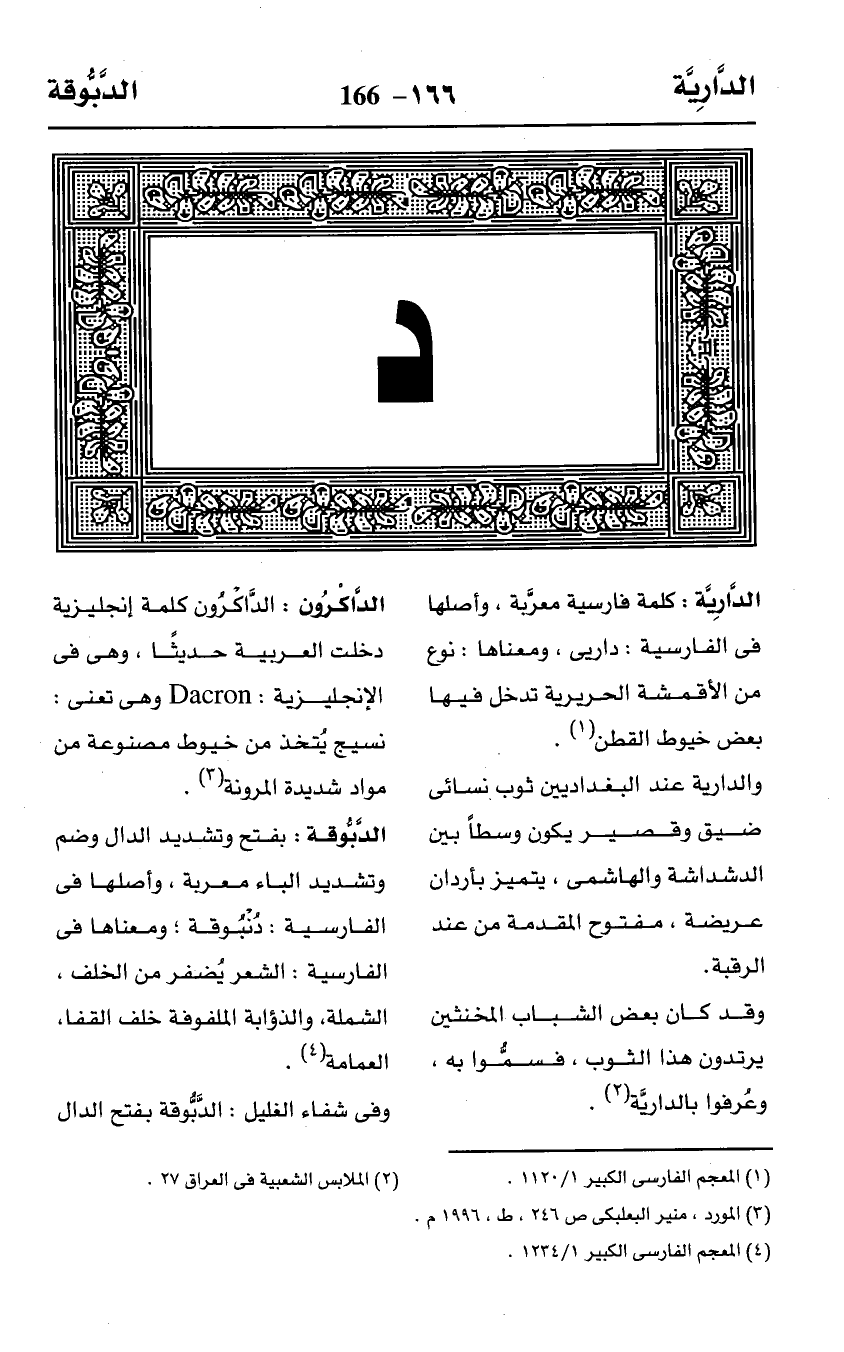 الدَّاكْرُون: الدَّاكْرُون كلمة إنجليزية دخلت العربية حديثًا، وهى في الإنجليزية: Dacron وهى تعنى: نسيج يُتخذ من خيوط مصنوعة من مواد شديدة المرونة (¬3).