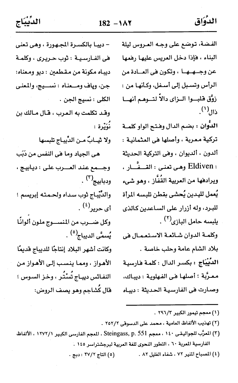 الدِّيْبَاج: بكسر الدال: كلمة فارسية معرَّبة؛ أصلها في الفهلوية: ديباك، وصارت في الفارسية الحديثة: ديباه - ديبا بالكسرة المجهورة، وهى تعنى في الفارسية: ثوب حريرى، وكلمة ديباه مكونة من مقطعين: ديو ومعناه: جن، وياف ومعناه: نسيج، والمعنى الكلى: نسيج الجن.