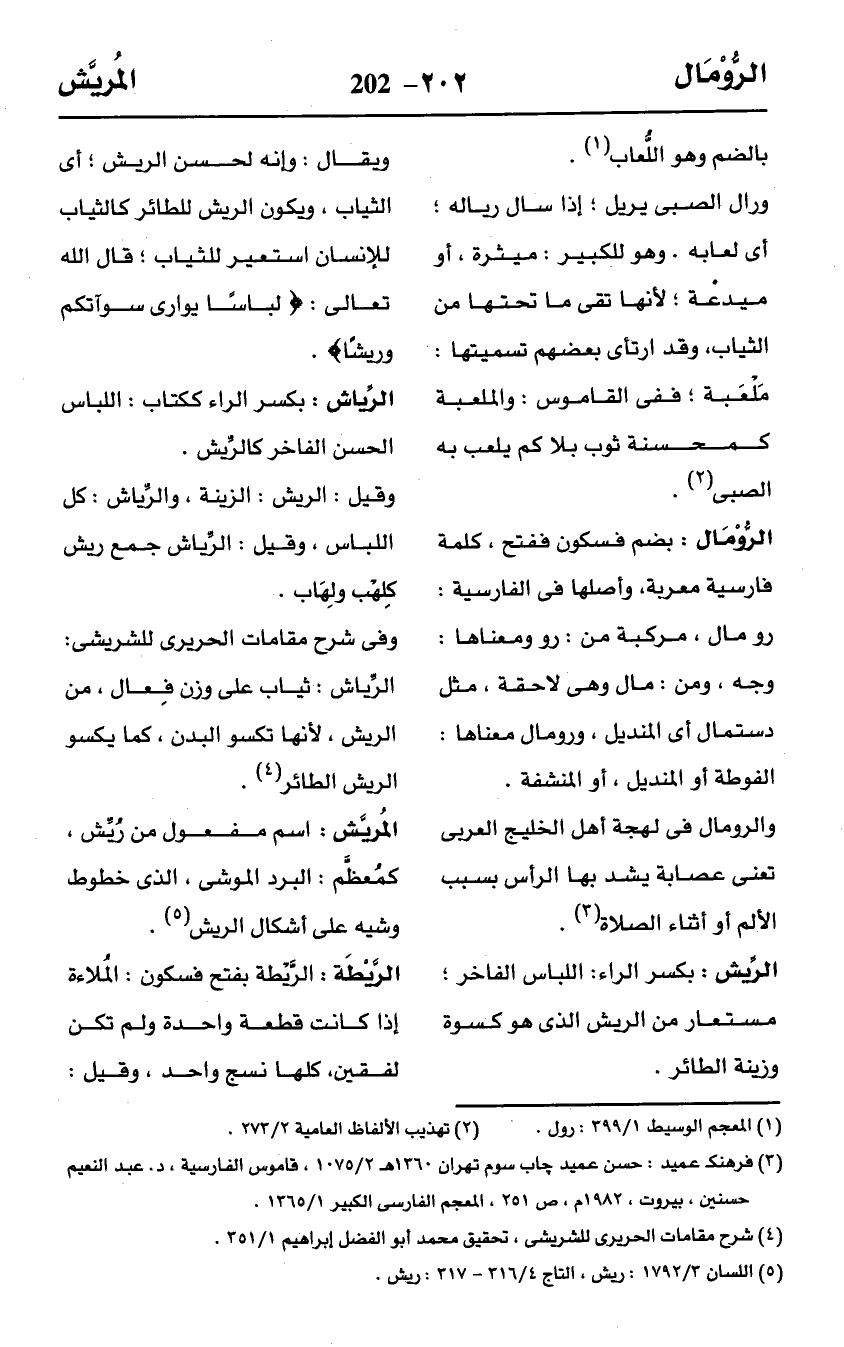 وفى شرح مقامات الحريرى للشريشى: الرِّياش: ثياب على وزن فِعال، من الريش، لأنها تكسو البدن، كما يكسو الريش الطائر (¬4).