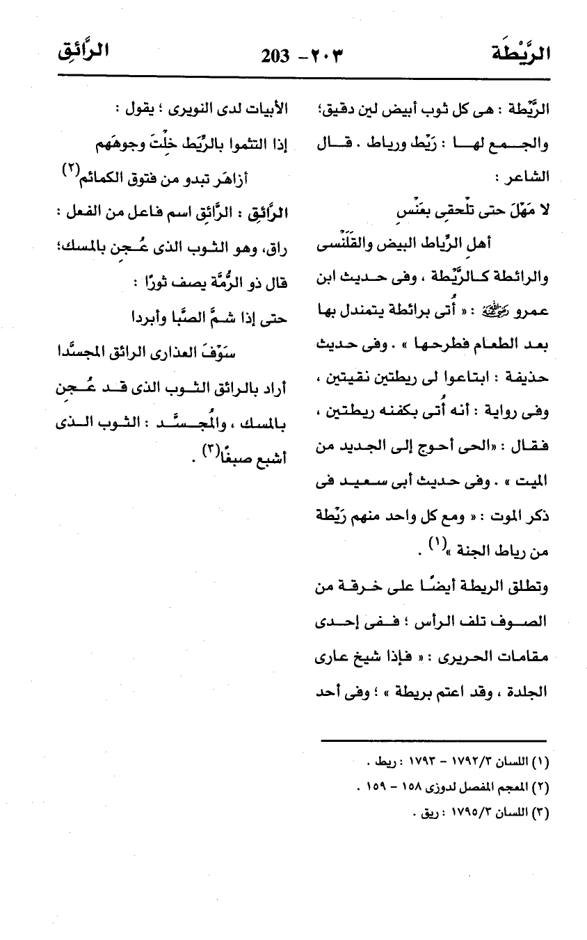 والرائطة كالرَّيْطة، وفى حديث ابن عمرو -رضي اللَّه عنه-: "أُتى برائطة يتمندل بها بعد الطعام فطرحها". وفى حديث حذيفة: ابتاعوا لى ريطتين نقيتين، وفى رواية: أنه أُتى بكفنه ريطتين، فقال: "الحى أحوج إلى الجديد من الميت". وفى حديث أبى سعيد في ذكر الموت: "ومع كل واحد منهم رَيْطة من رياط الجنة" (¬1).