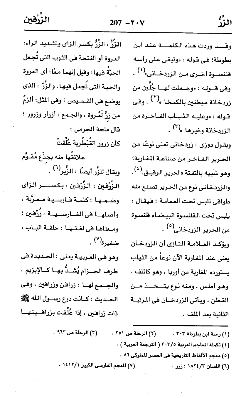 وقد وردت هذه الكلمة عند ابن بطوطة؛ في قوله: "وتبقى على رأسه قلنسوة أخرى من الزردخانى" (¬1). وفى قوله: "وجعلت لها جُلَّين من زردخانة مبطنين بالكمخا" (¬2)، وفى قوله: "وعليه الثياب الفاخرة من الزردخانة وغيرها" (¬3).