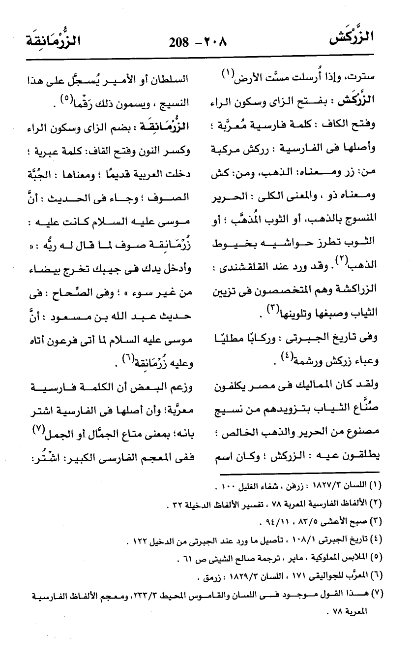 الزَّرْكَش: بفتح الزاى وسكون الراء وفتح الكاف: كلمة فارسية مُعرَّبة؛ وأصلها في الفارسية: زركش مركبة من: زر ومعناه: الذهب، ومن: كش ومعناه ذو، والمعنى الكلى: الحرير المنسوج بالذهب، أو الثوب المُذهَّب؛ أو الثوب تطرز حواشيه بخيوط الذهب (¬2). وقد ورد عند القلقشندى: الزراكشة وهم المتخصصون في تزيين الثياب وصبغها وتلوينها (¬3).