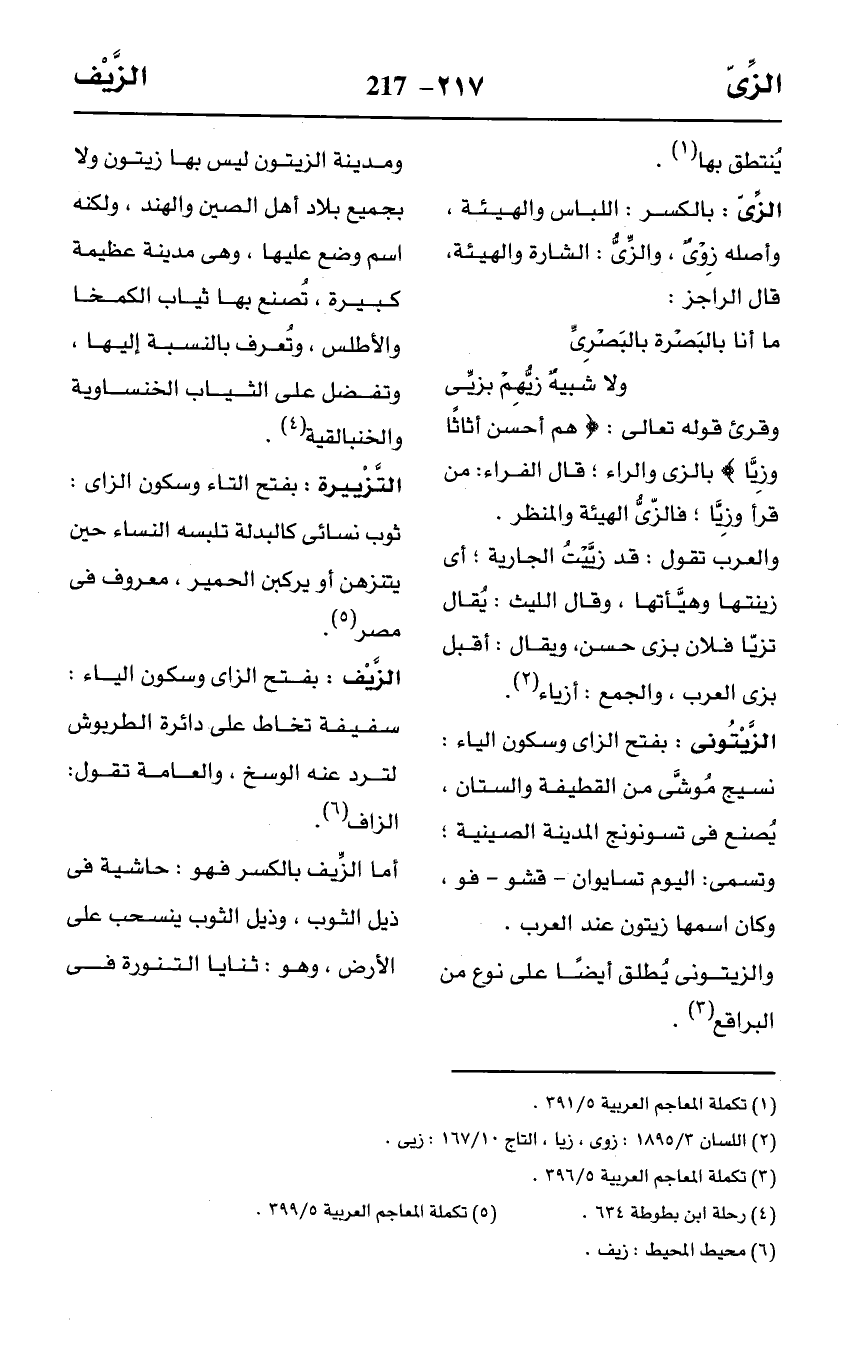 والزيتونى يُطلق أيضًا على نوع من البراقع (¬3). ومدينة الزيتون ليس بها زيتون ولا بجميع بلاد أهل الصين والهند، ولكنه اسم وضع عليها، وهى مدينة عظيمة كبيرة، تُصنع بها ثياب الكمخا والأطلس، وتُعرف بالنسبة إليها، وتفضل على الثياب الخنساوية والخنبالقية (¬4).