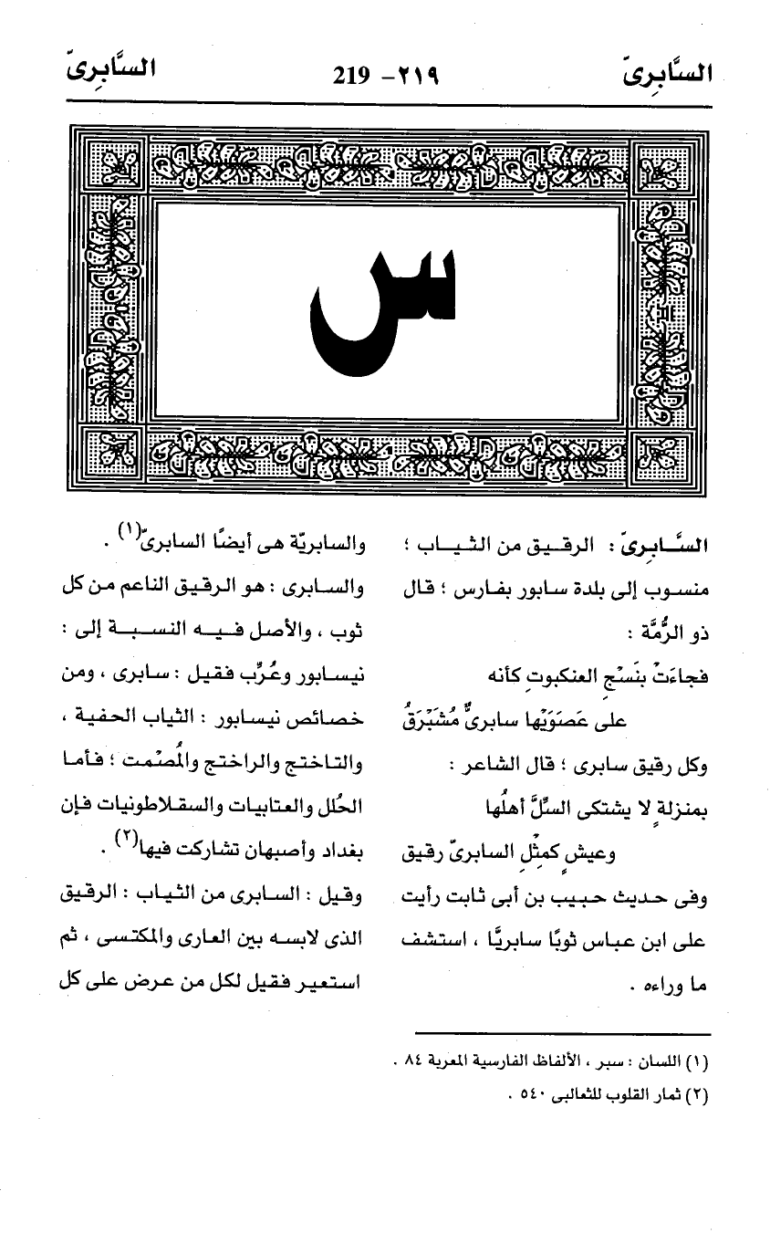 وفى حديث حبيب بن أبى ثابت رأيت على ابن عباس ثوبًا سابريّا، استشف ما وراءه. والسابريّة هى أيضًا السابرىّ (¬1).