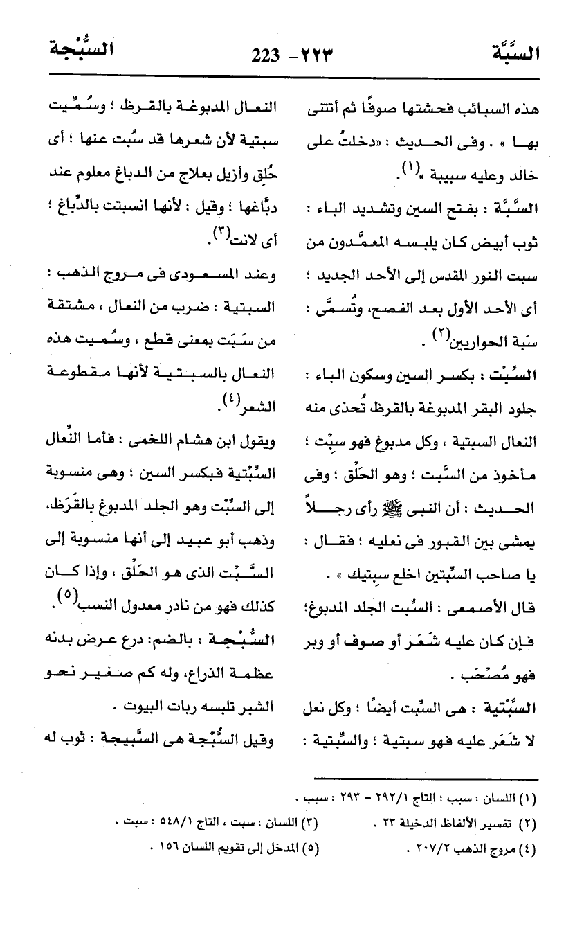 وعند المسعودى في مروج الذهب: السبتية: ضرب من النعال، مشتقة من سَبَت بمعنى قطع، وسُميت هذه النعال بالسبتية لأنها مقطوعة الشعر (¬4).