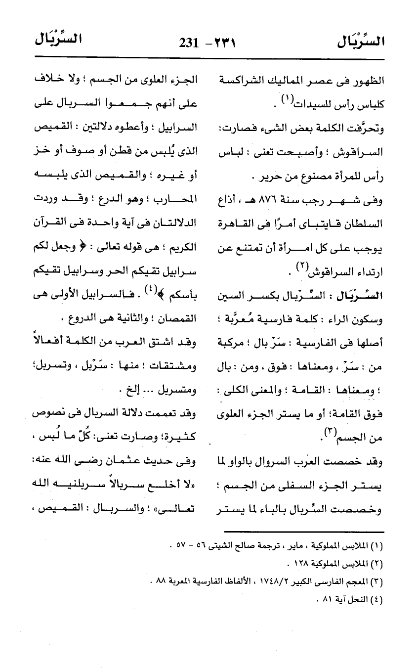 السِّرْبَال: السِّرْبَال بكسر السين وسكون الراء: كلمة فارسية مُعرَّبة؛ أصلها في الفارسية: سَرْ بال؛ مركبة من: سَرْ، ومعناها: فوق، ومن: بال؛ ومعناها: القامة؛ والمعنى الكلى: فوق القامة؛ أو ما يستر الجزء العلوى من الجسم (¬3).