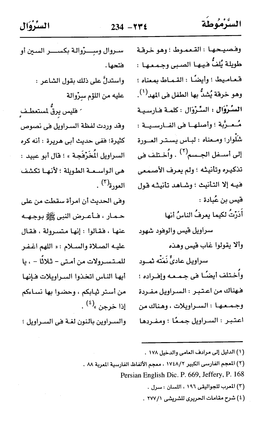 السِّرْوَال: السِّرْوَال: كلمة فارسية مُعرَّبة؛ وأصلها في الفارسية: شَلْوار؛ ومعناه: لباس يستر العورة إلى أسفل الجسم (¬2). واختلف في تذكيره وتأنيثه؛ ولم يعرف الأصمعي فيه إلا التأنيث؛ وشاهد تأنيثه قول قيس بن عُبادة:
