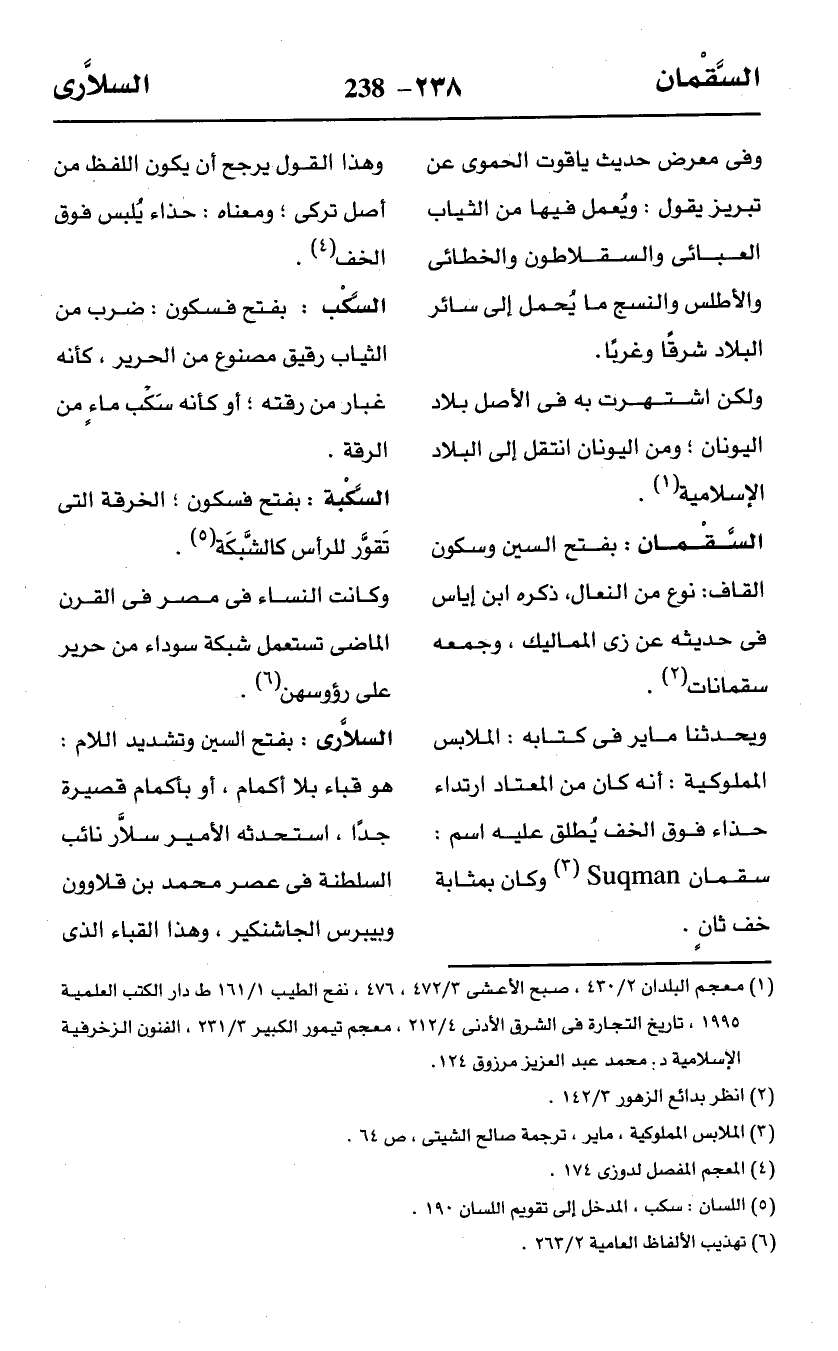 ويحدثنا ماير في كتابه: الملابس المملوكية: أنه كان من المعتاد ارتداء حذاء فوق الخف يُطلق عليه اسم: سقمان Suqman (¬3) وكان بمثابة خف ثانٍ.