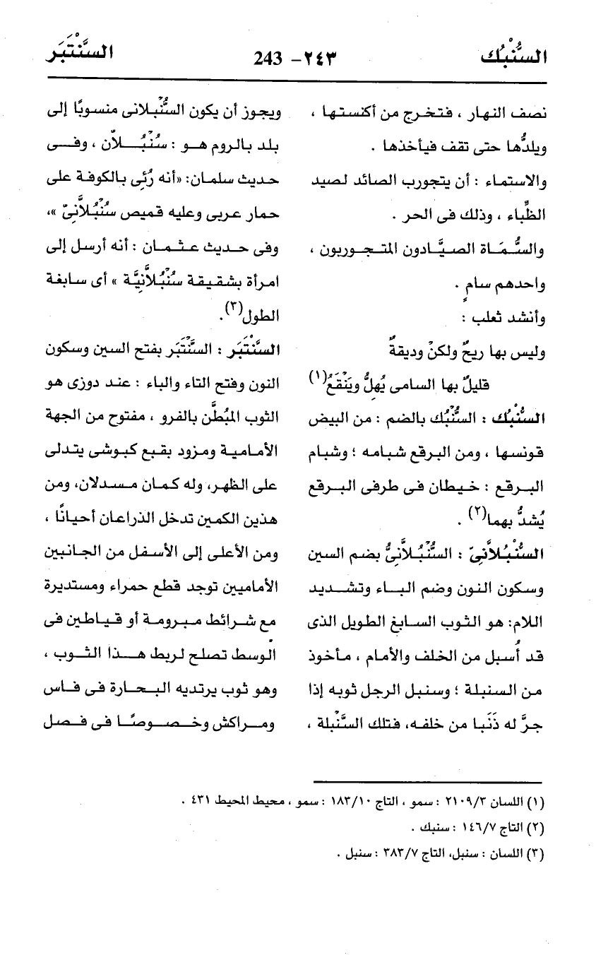 السُّنْبُلَّانِيّ: السُّنبُلَّانِيُّ بضم السين وسكون النون وضم الباء وتشديد اللام: هو الثوب السابغ الطويل الذى قد أُسبل من الخلف والأمام، مأخوذ من السنبلة؛ وسنبل الرجل ثوبه إذا جرَّ له ذَنَبا من خلفه، فتلك السَّنْبلة، ويجوز أن يكون السُّنْبلانى منسوبًا إلى بلد بالروم هو: سُنْبُلّان، وفى حديث سلمان: "أنه رُئِى بالكوفة على حمار عربى وعليه قميص سُنْبُلَّانِيّ"، وفى حديث عثمان: أنه أرسل إلى امرأة بشقيقة سُنْبُلَّانِيَّة" أى سابغة الطول (¬3).