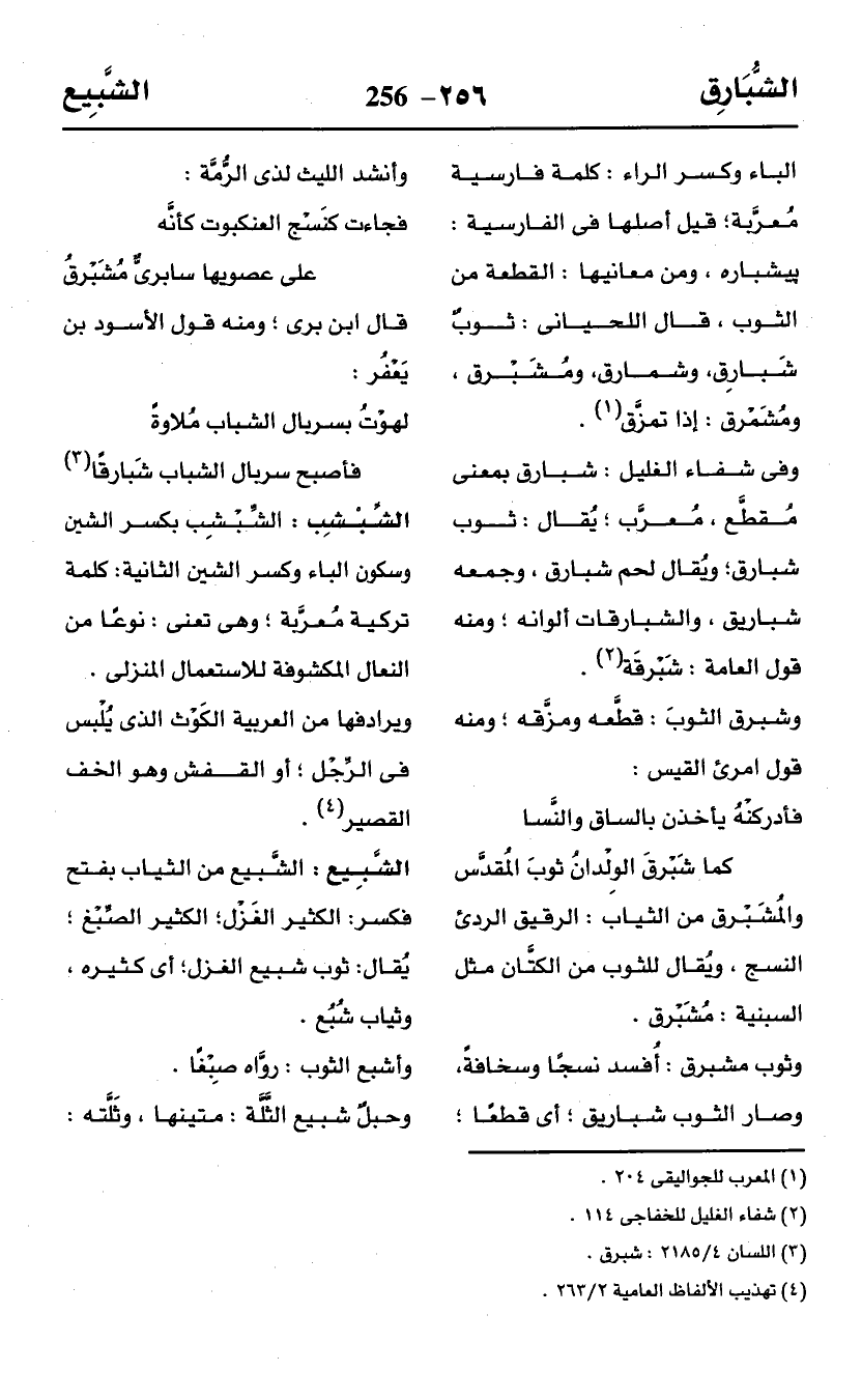 وفي شفاء الغليل: شبارق بمعنى مُقطَّع، مُعرَّب؛ يُقال: ثوب شبارق؛ ويُقال لحم شبارق، وجمعه شباريق، والشبارقات ألوانه؛ ومنه قول العامة: شَبْرقَة (¬2).