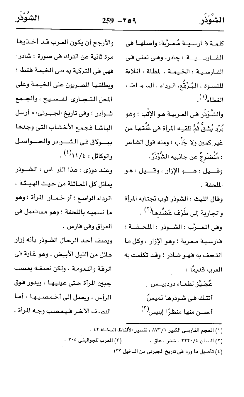 وعند دوزى: هذا اللباس: الشوذر يماثل كل المماثلة من حيث الهيئة، الرداء الواسع؛ أو خمار المرأة؛ وهو ما نسميه بالملحفة؛ وهو مستعمل في العراق وفي فارس.