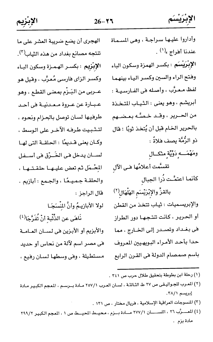 (¬2) المعرب للجواليقى ص 27 ط الثالثة، لسان العرب 1/ 257 مادة برسم، المعجم الكبير مادة إبريسم 1/ 38.